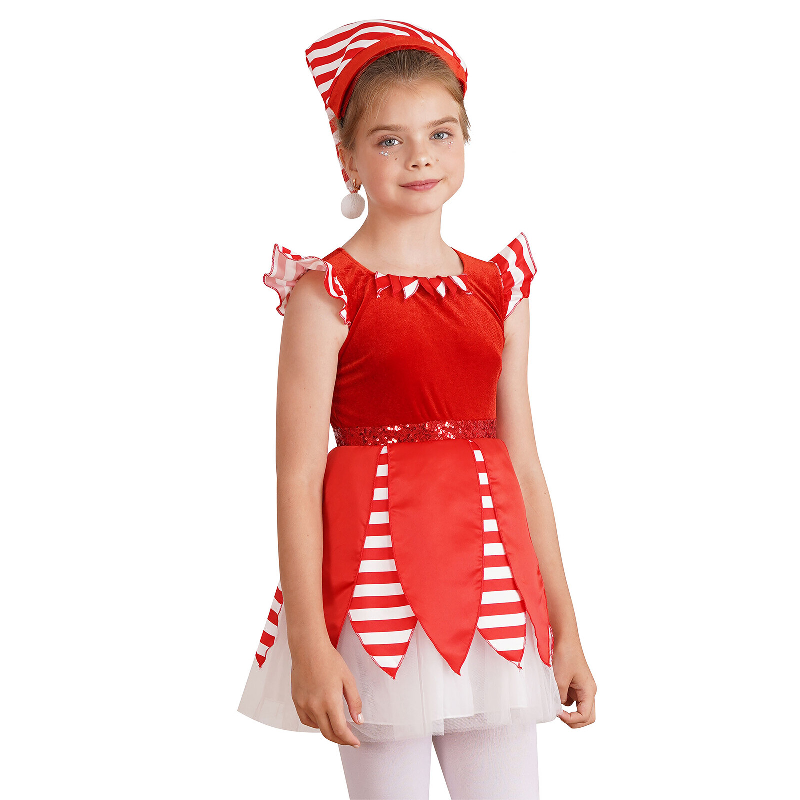 US Girls Christmas Elf Costume Santa Helper Velvet Striped Tutu Dress with Hat