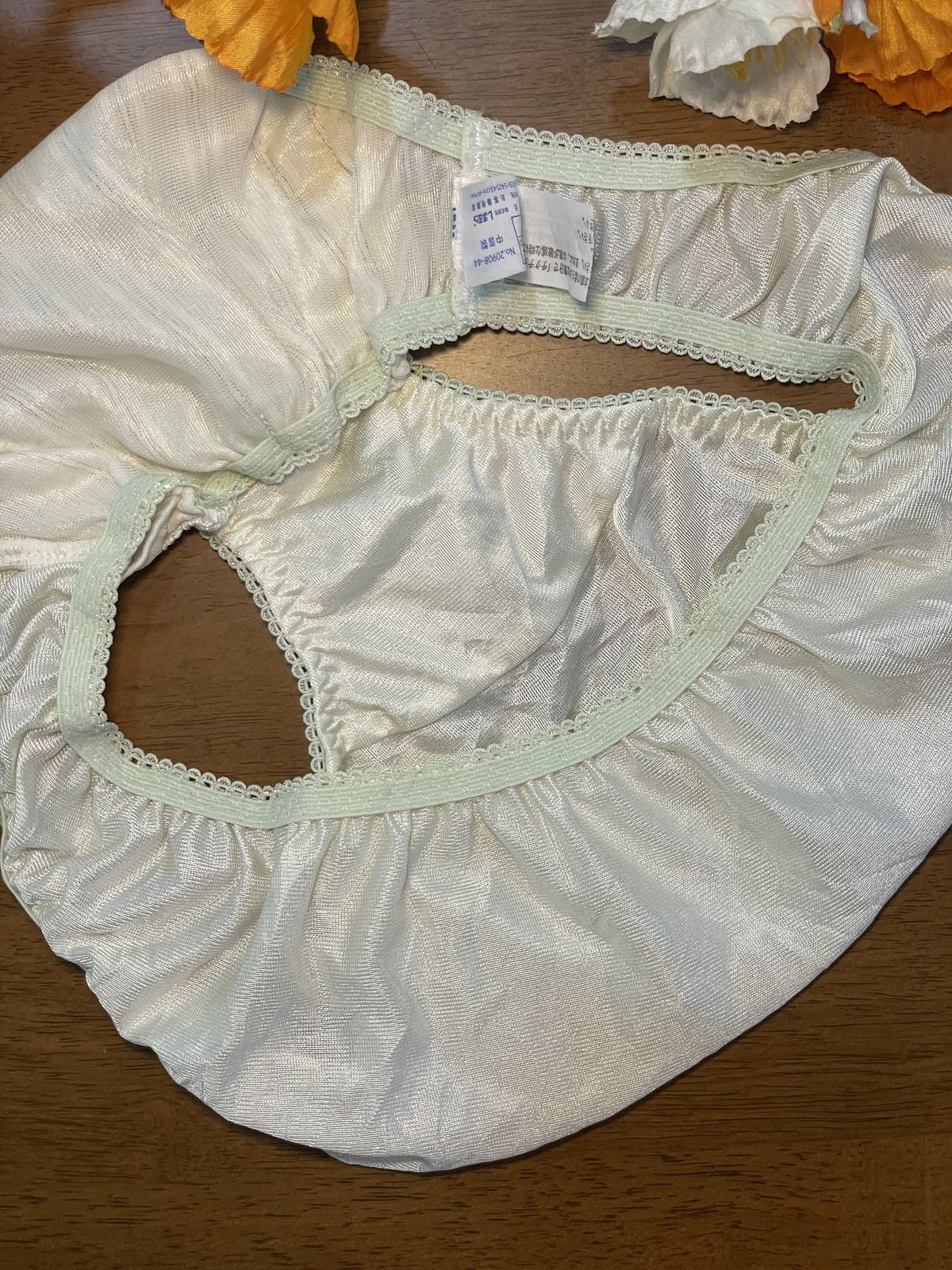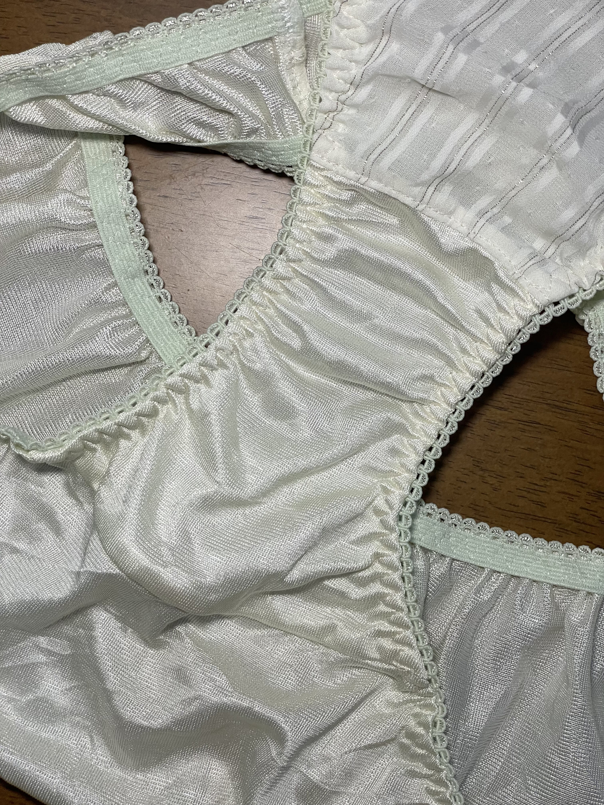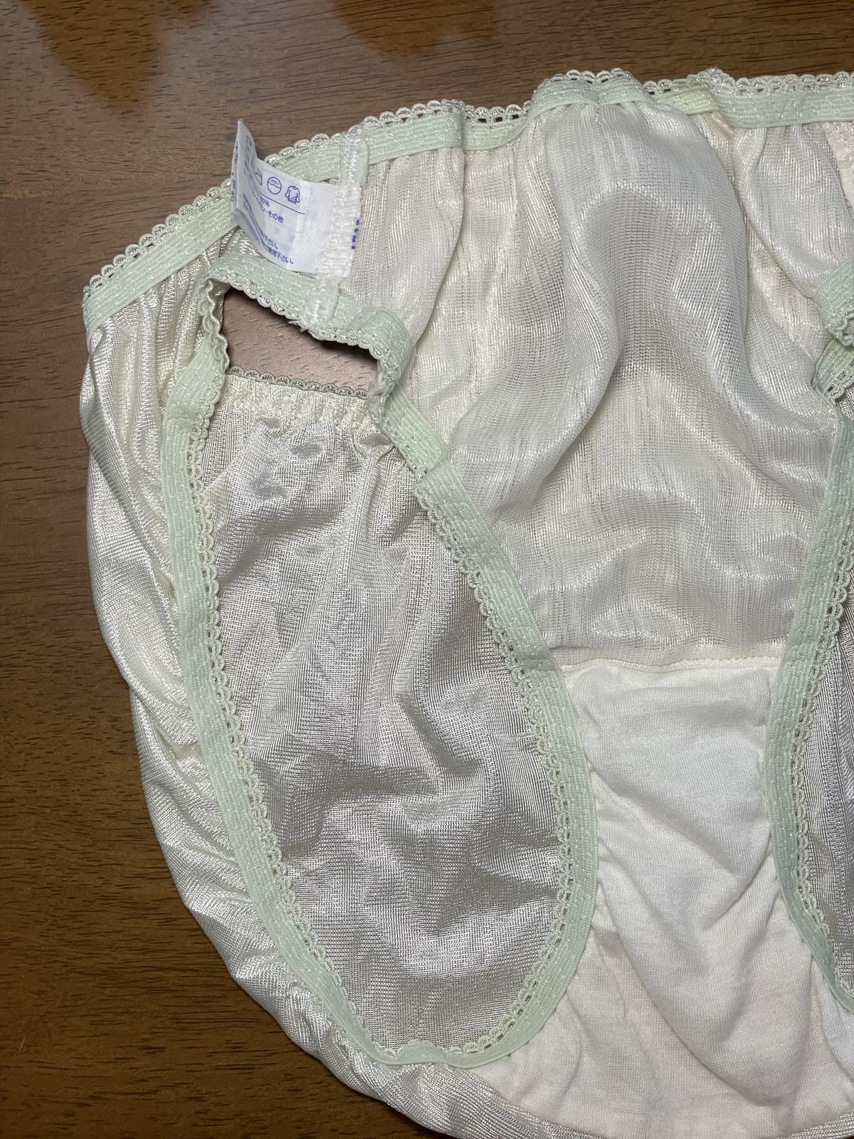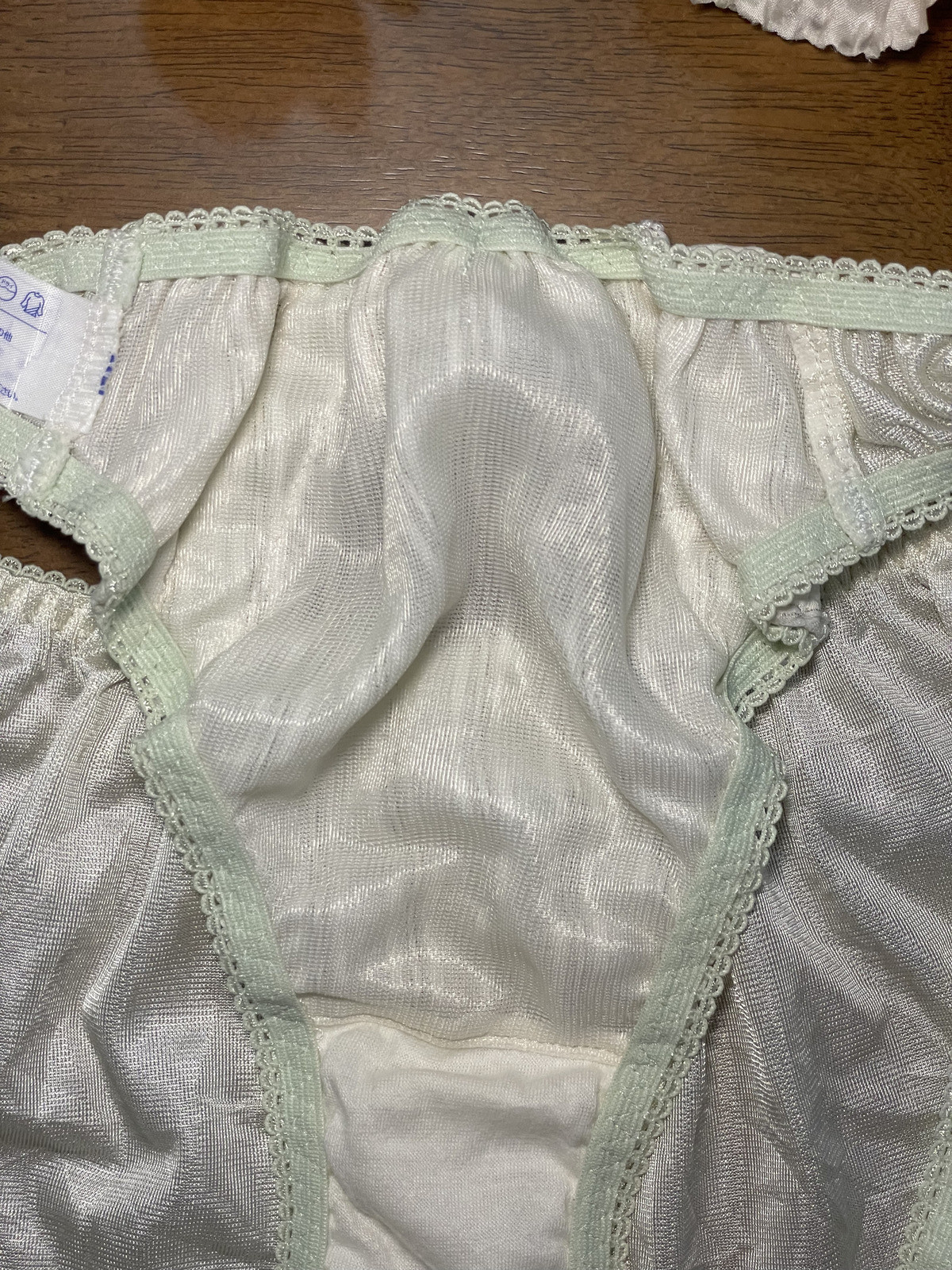 как выглядит Pale Green Polyester Nylon Silky Panty Vtg Sheer Hi Cut White Lace Briefs Sz.6/M фото
