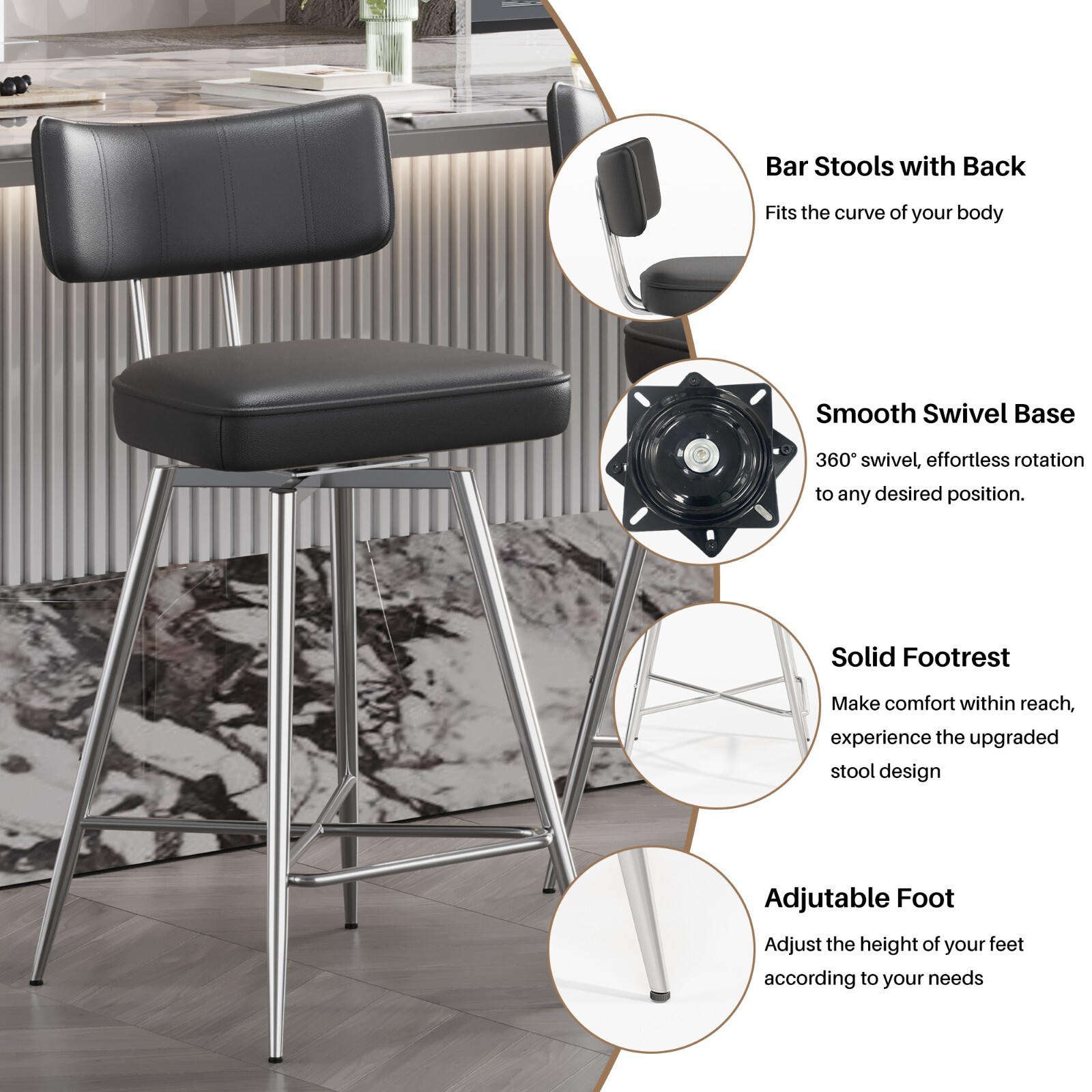 Set of 2 Counter Height Stools Swivel Dining Chairs for Kitchen Island 26''