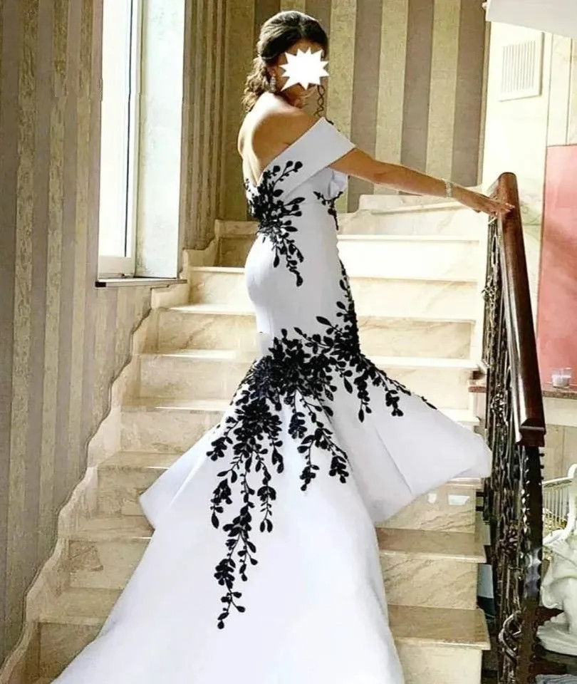 как выглядит White Mermaid Wedding Dresses Black Satin Lace Appliqued Bridal Gown Court Train фото