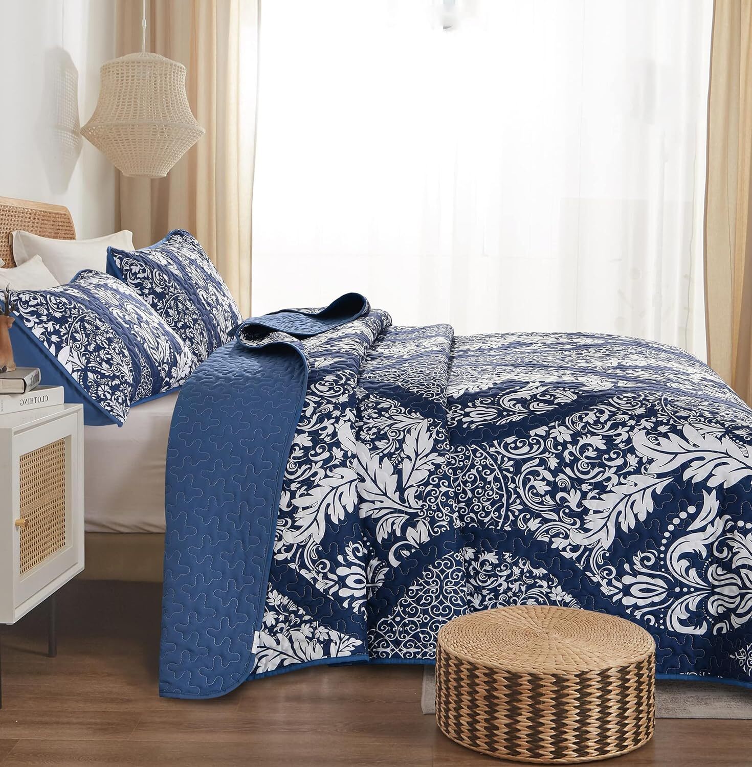 Navy Quilt Set King Size Boho Damask Bedspread Coverlet Set Lightweight 3 Pieces