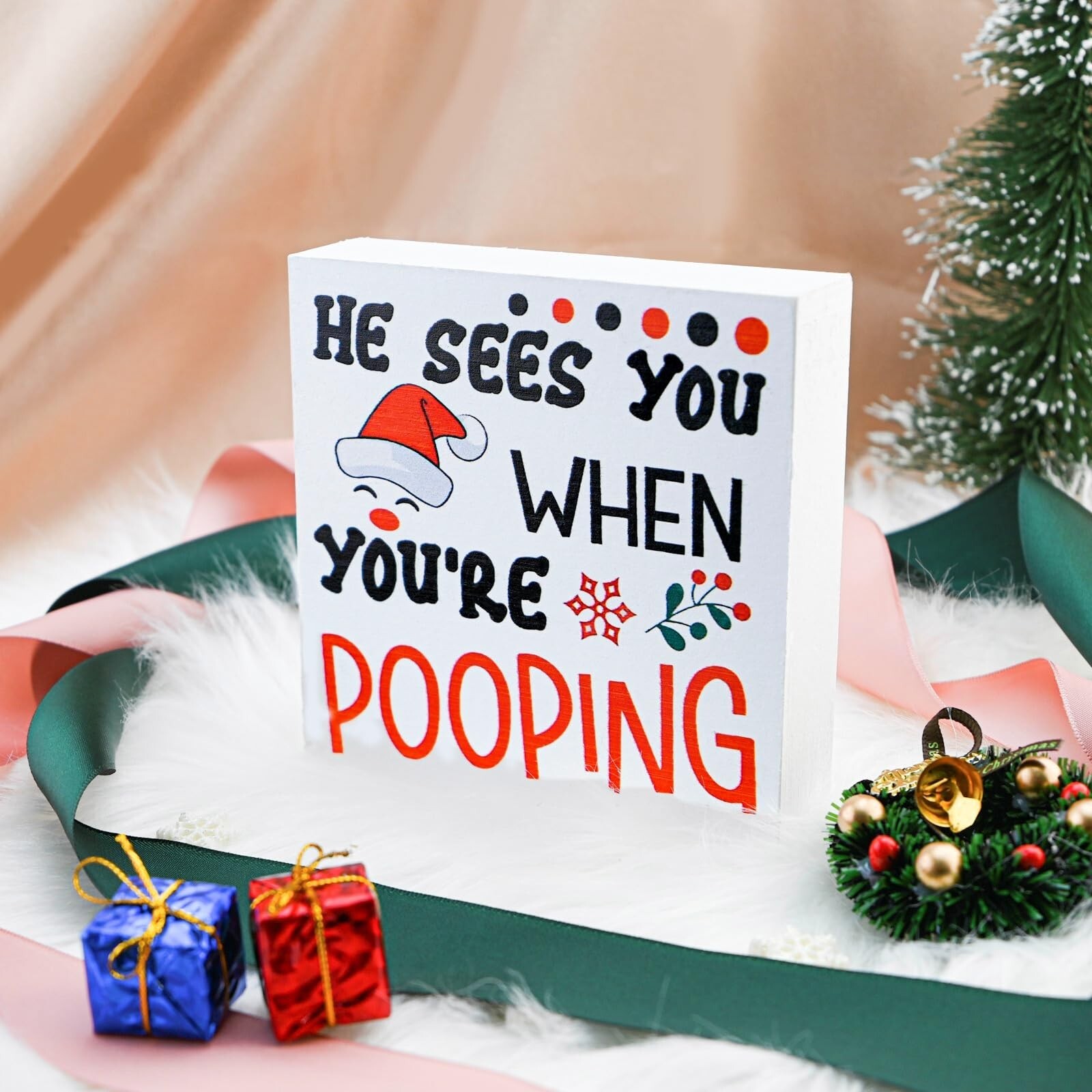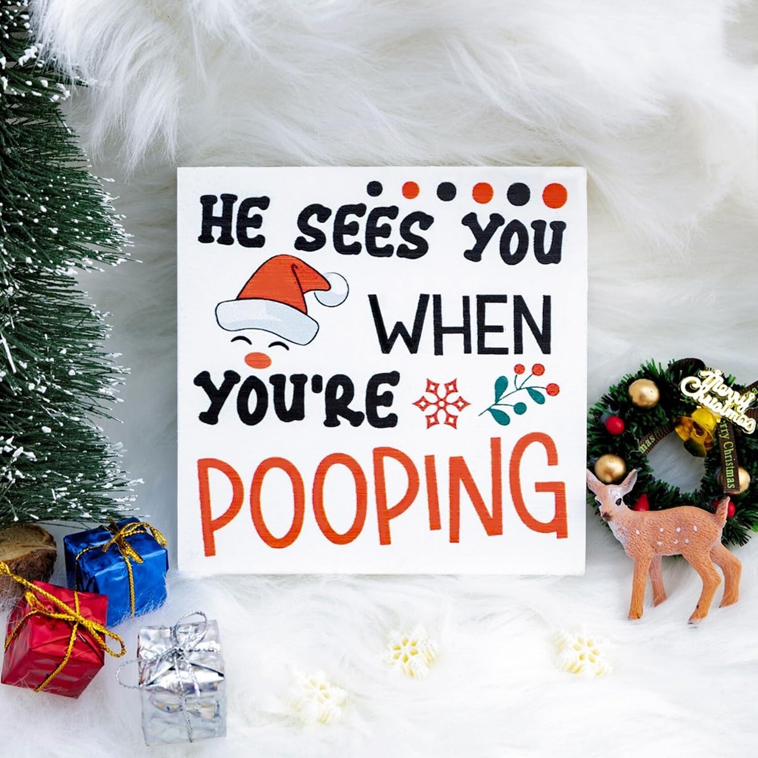 He Sees You When You'Re Pooping Sign Funny Christmas Bathroom Decor Santa Bat...