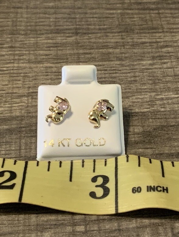 14K Yellow Real Solid Gold Cz Pink Elephant Sleeper Studs Earrings Screw-back