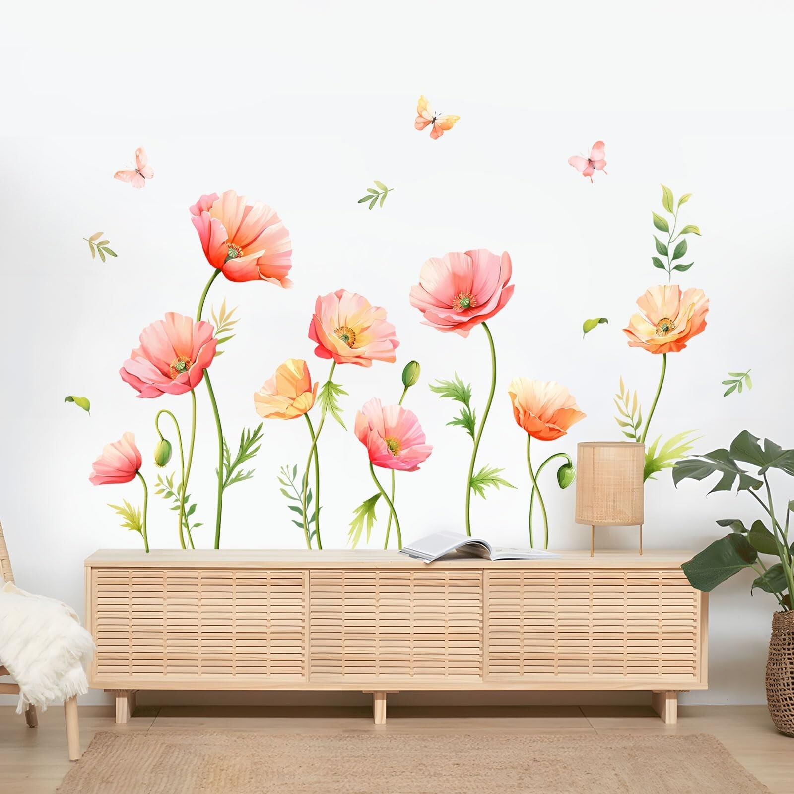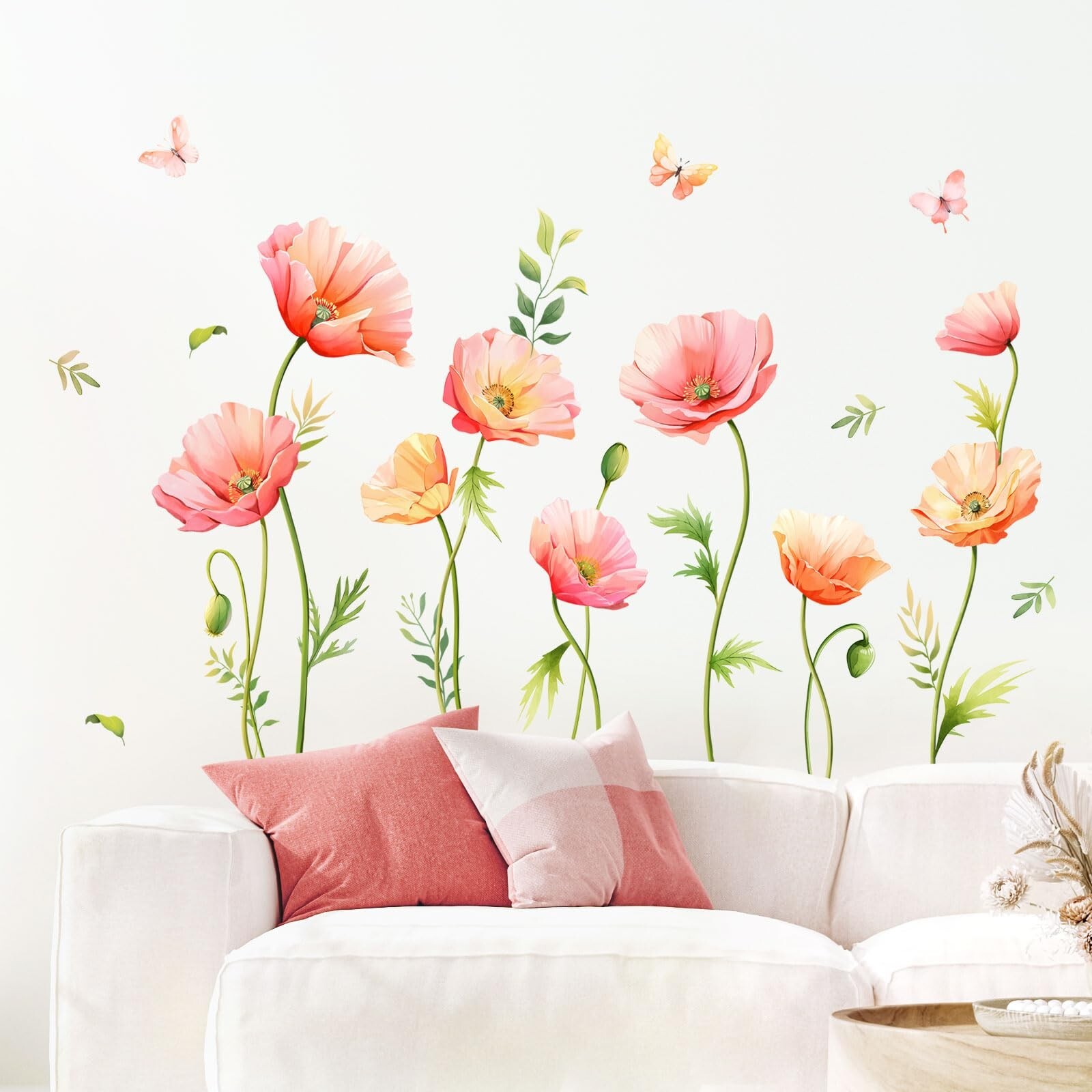 Large Pink Floral Wall Decals Poppy Flower Butterfly Wall Stickers Peel and S...