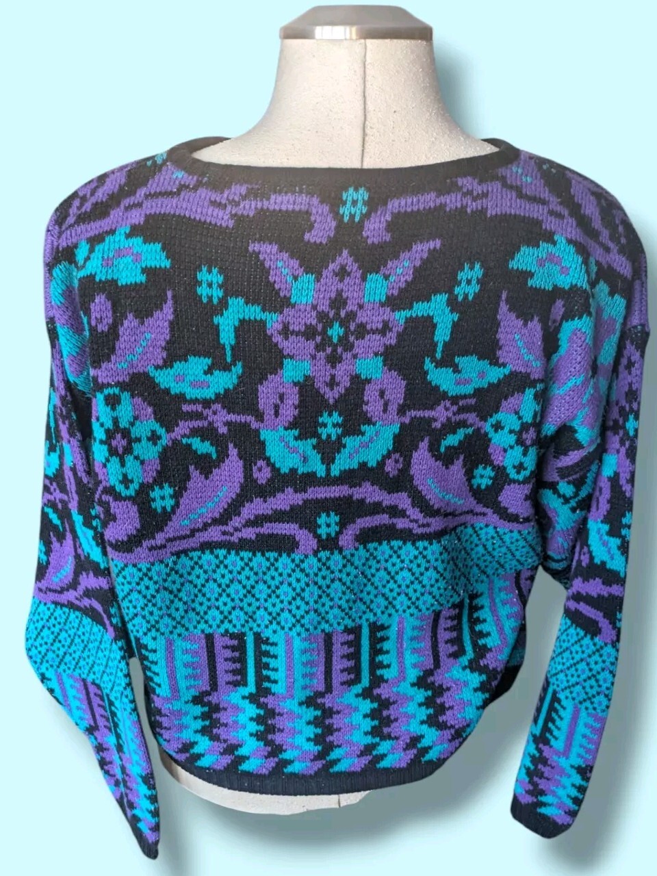 Vintage 80s Floral Design Sweater Size 42/L Purple/Turq/Black Grandma Retro