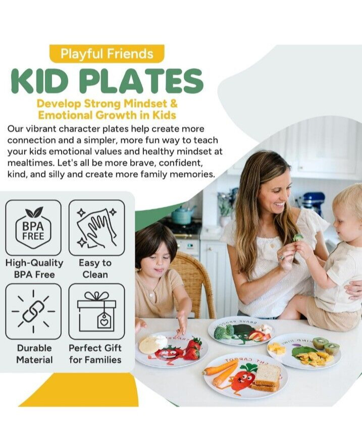 NIB Set of 4 10 Baby Kids Toddler Plates Playful Friends Healthy Mindset NEW