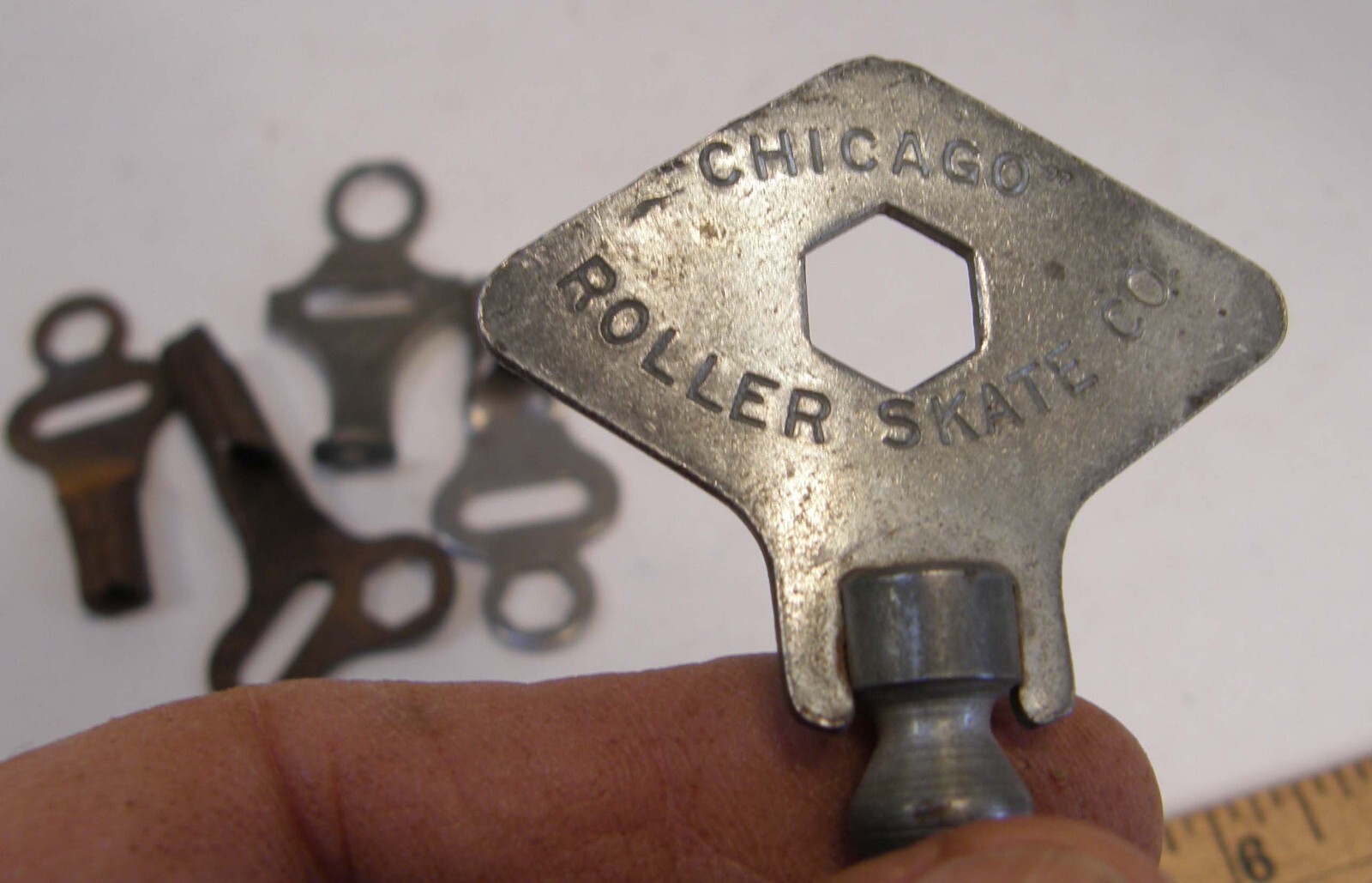 как выглядит LOT 5 VINTAGE SKATE KEYS INCLUDING CHICAGO ROLLER SKATE COMPANY фото