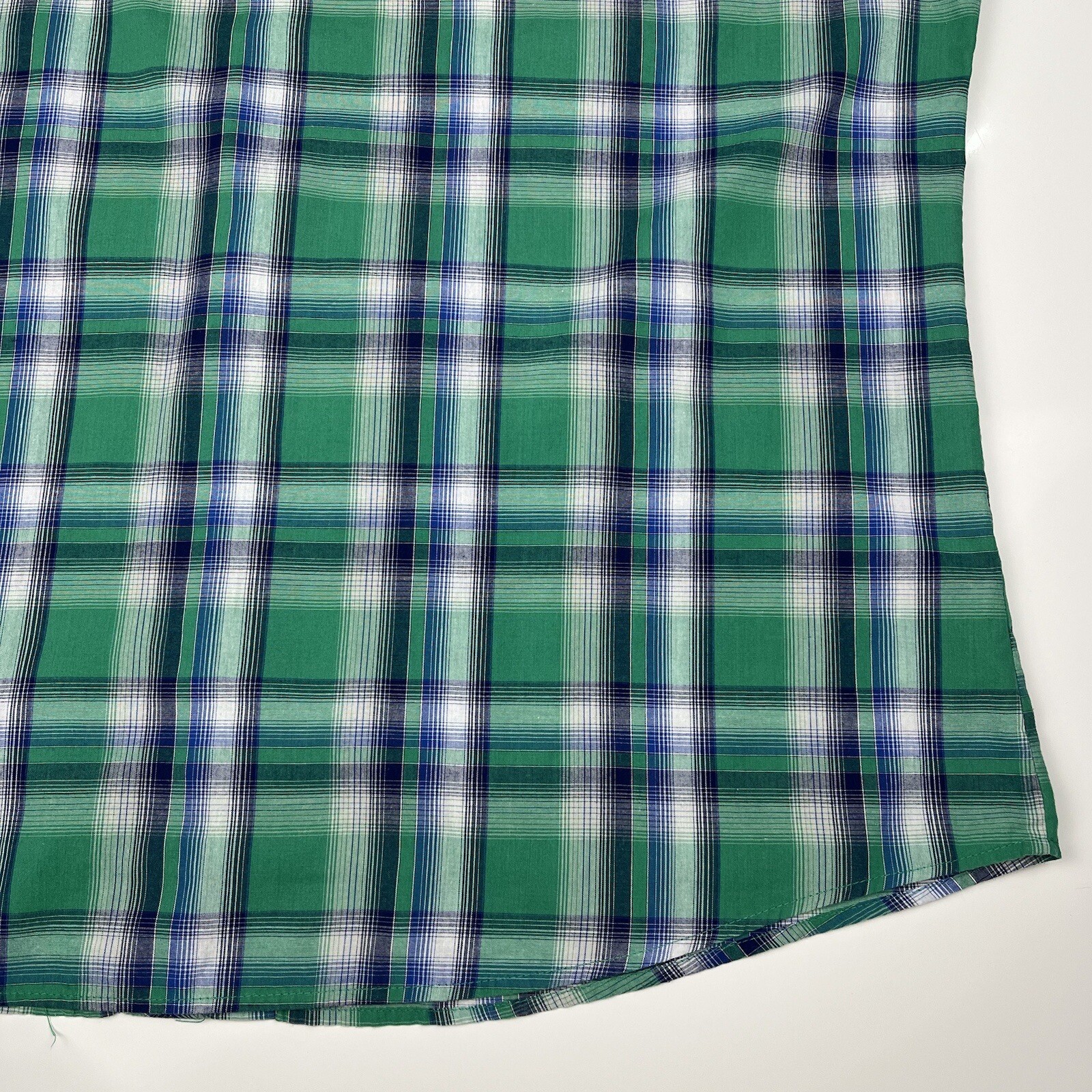 как выглядит Vintage 90s Wrangler Western Shirt Blue Green Plaid Pearl Snaps Men