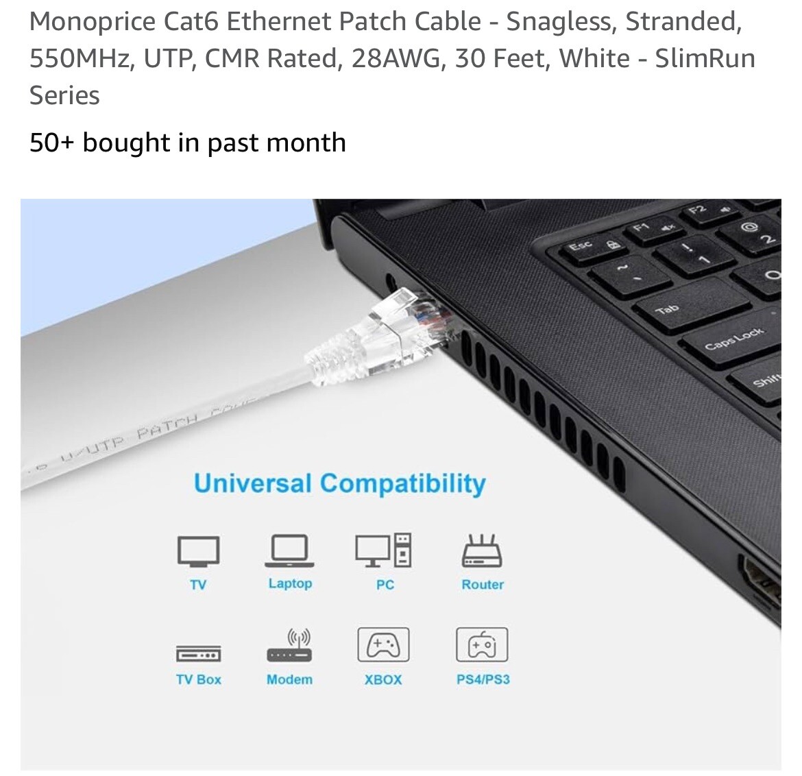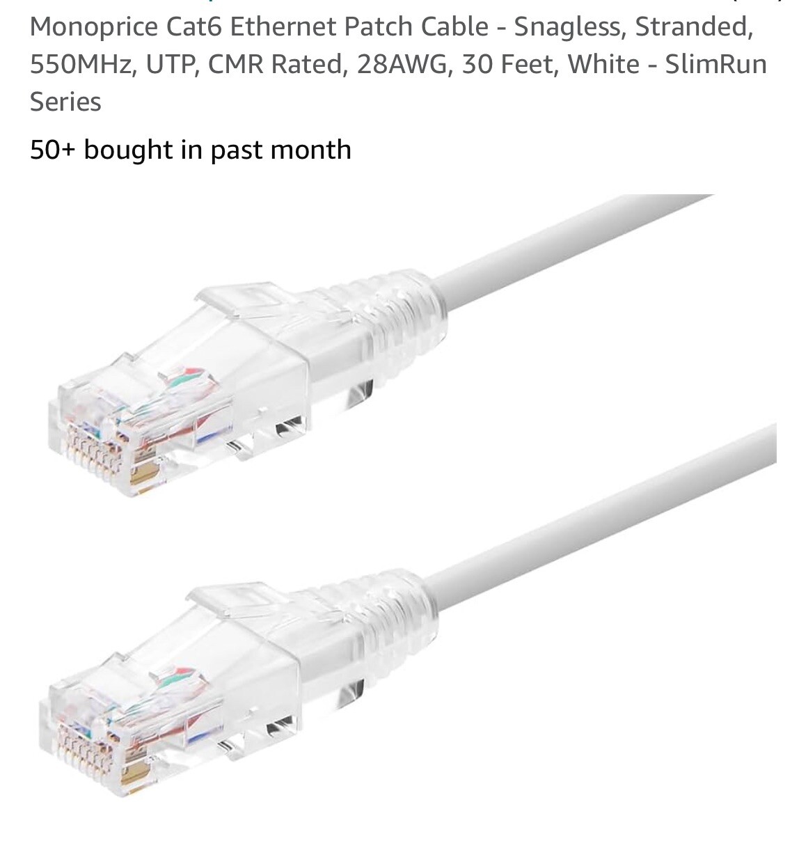 Monoprice Cat6 Ethernet Patch Cable Snagless, RJ45 Standard 550MHz 30ft White-A1