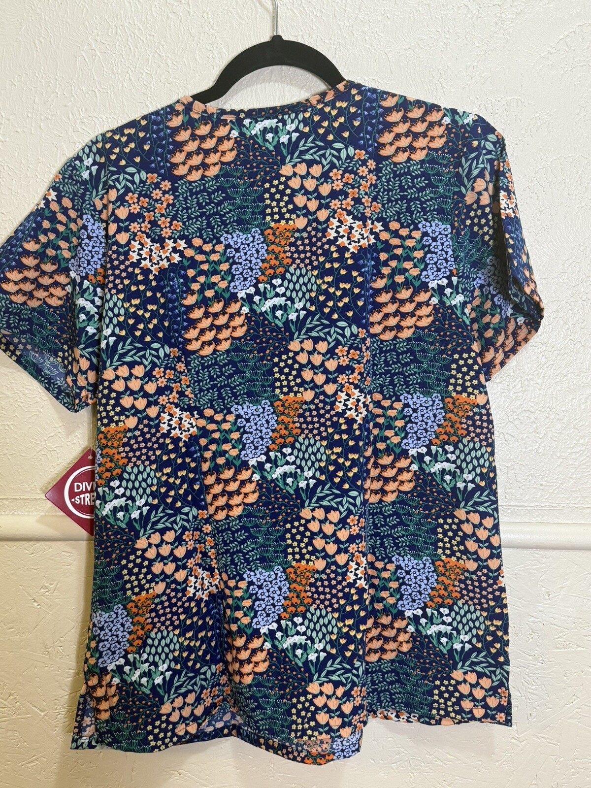 как выглядит Divine Stretch Navy Blue Floral Scrub Top Womens Large 3 Pocket фото