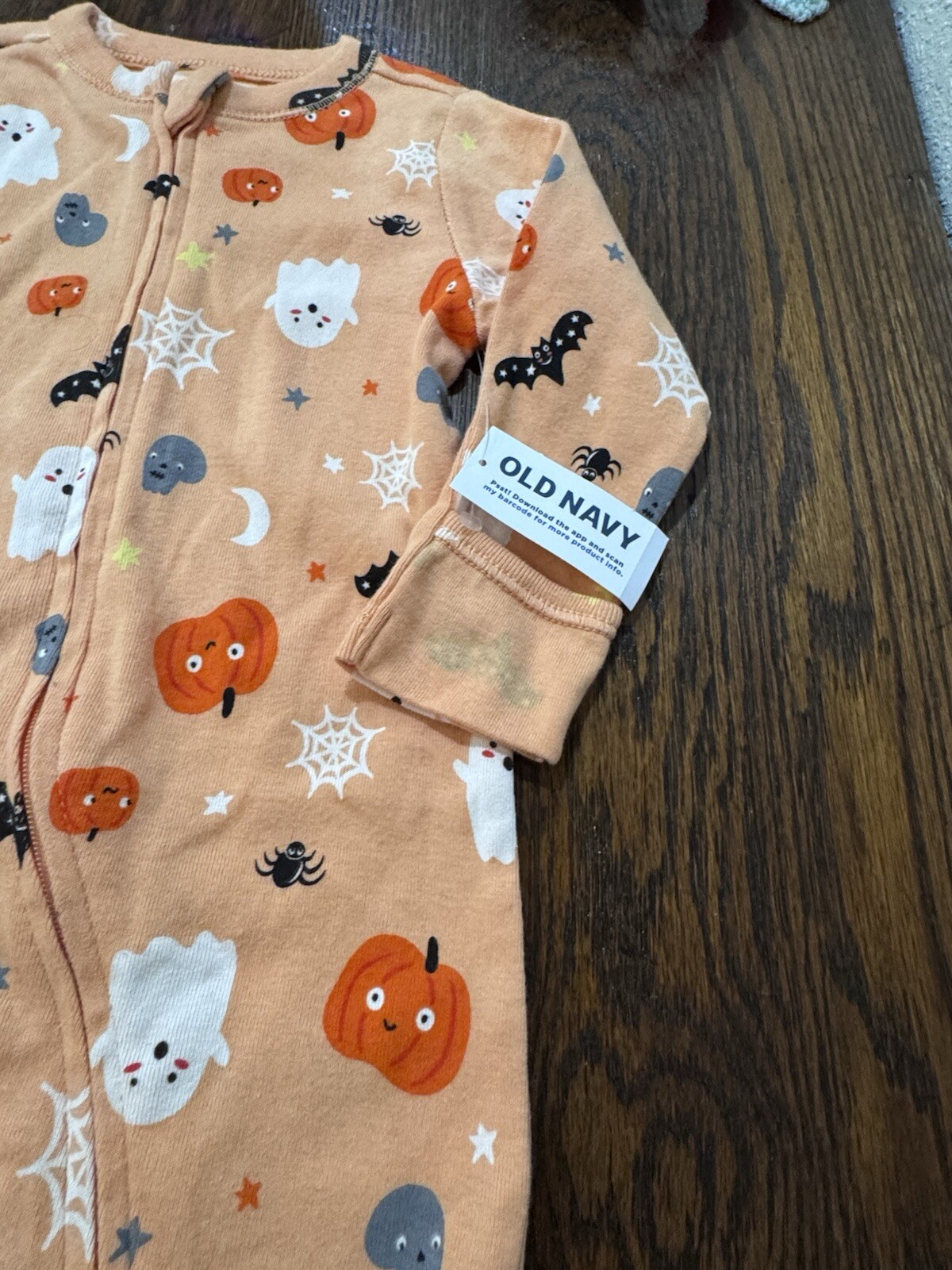 как выглядит Halloween Long Sleeve Bodysuit With Feet Pumpkins Bats Web Size 3-6 Months NWT фото