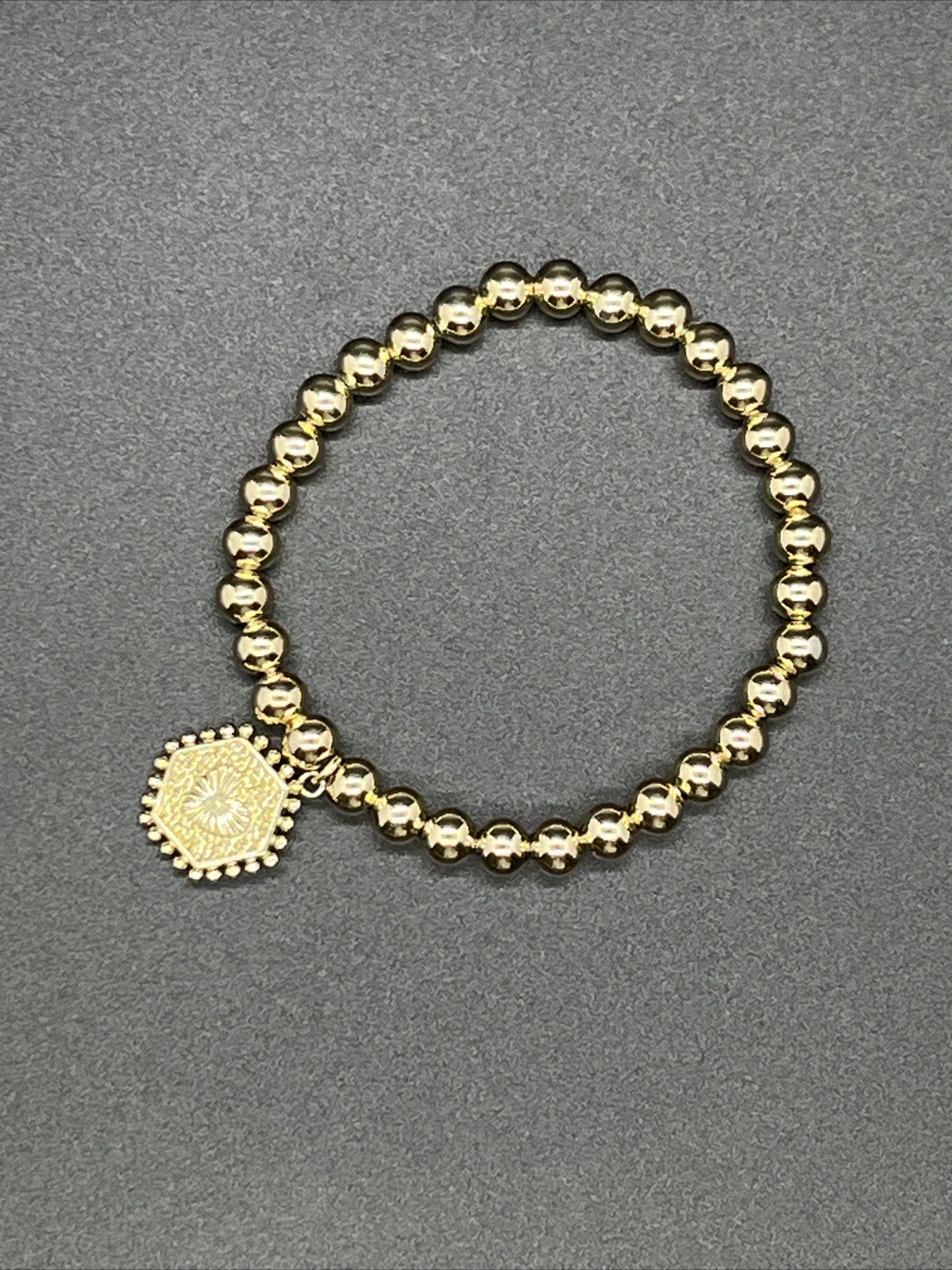 Rare Shiny Gold Beaded Vintage Bracelet with Dual Sided Gold Hexagon Charm