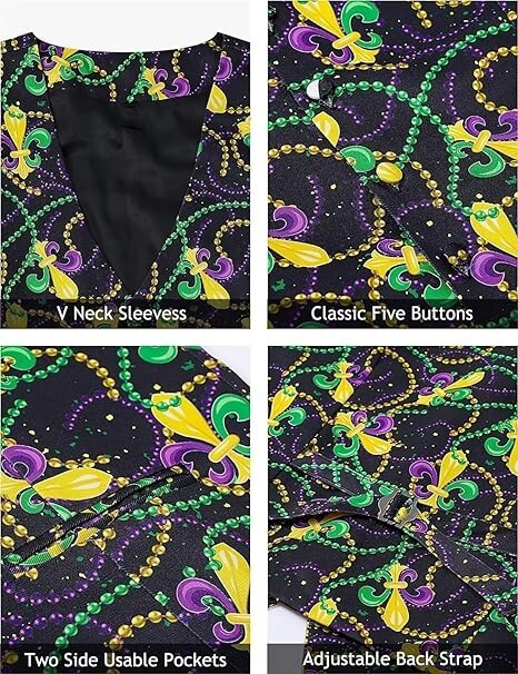 Mardi Gras Vest for Men Purple Green Gold Beads Mask Outfit Waistc...