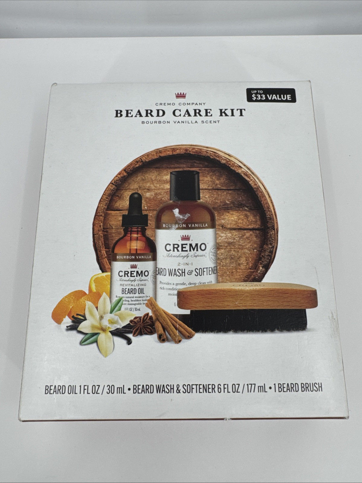 Cremo Mens Beard Grooming 3-PC Kit Wash/Softener-Oil-Brush Bourbon Vanilla Scent