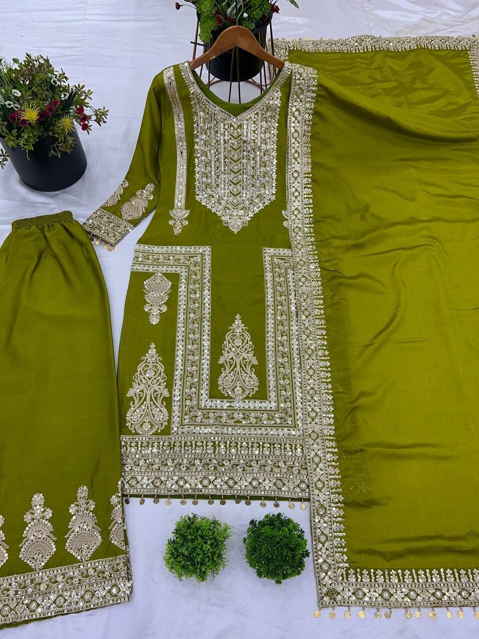 Pakistani Style Chinon Silk Kurta Palazzo With Dupatta For Eid
