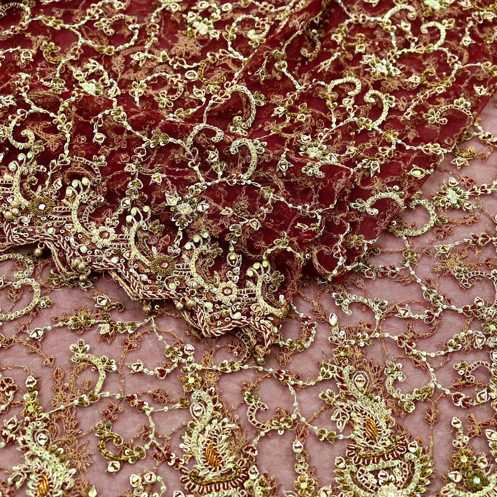 как выглядит Vintage Heavy Wedding Maroon Dupatta Net Mesh Long Stole Hand Embroidered Scarve фото