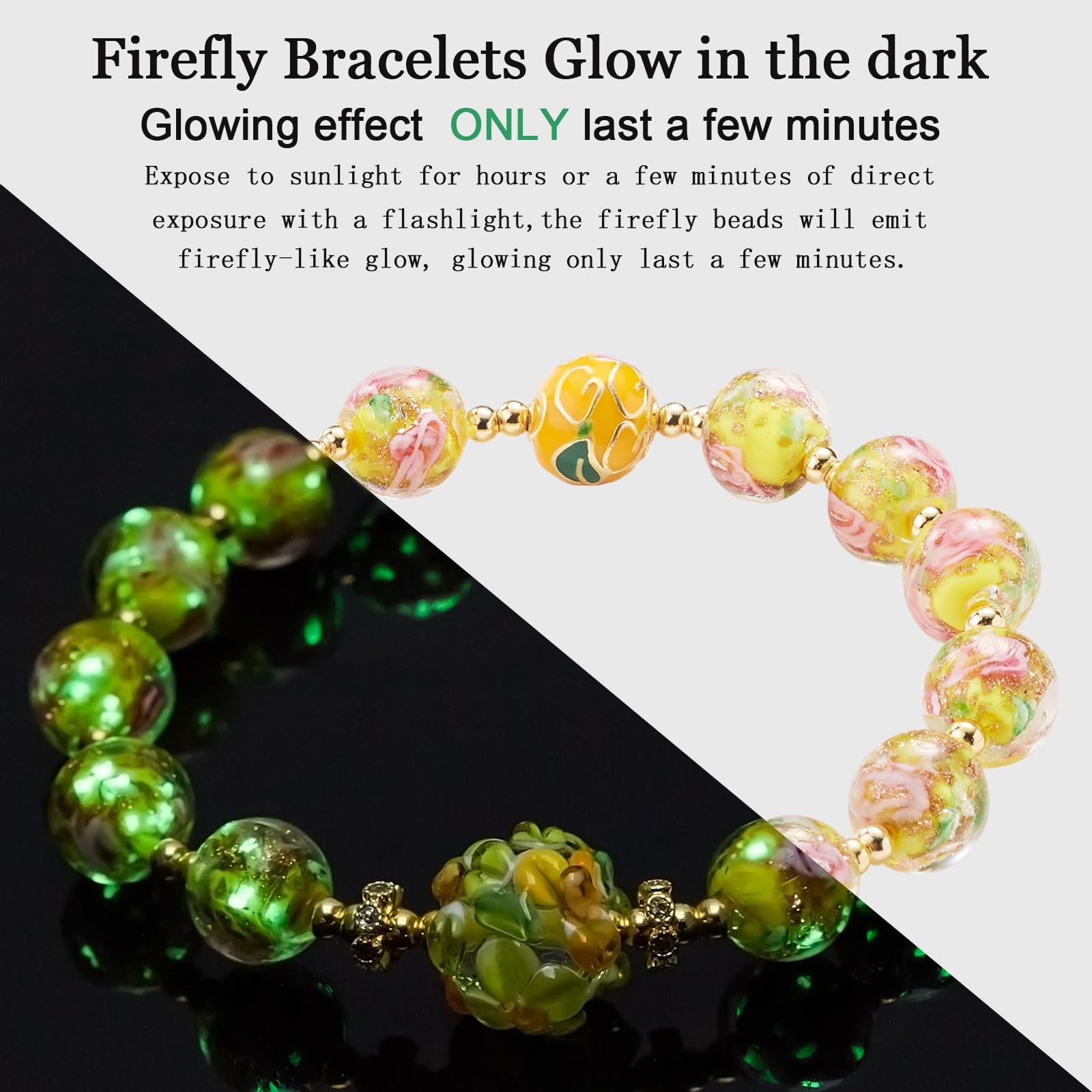 Glow in The Dark Beaded Bracelets - Yellow Firefly Beads Stretch Bracelet for Wo