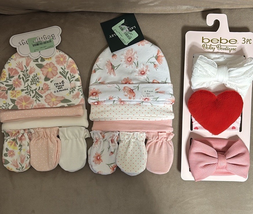 Bundle of 6 Hats ,6 Mittens /0-3 Months baby 3 baby Headbands