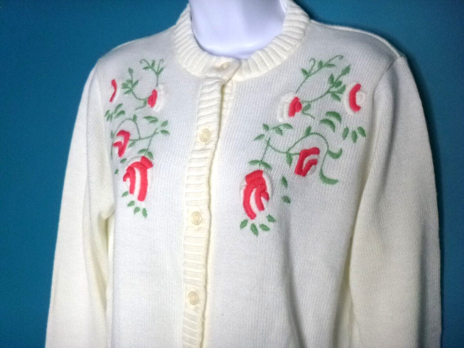 Vtg Acrylic Cardigan Off White W/ Floral Embroidery Sz 38 Made in Austria