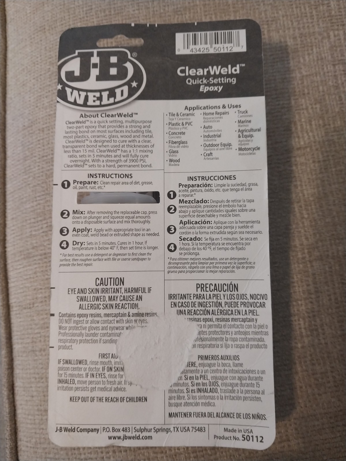 J-B Weld ClearWeld 5 Minute Epoxy, Clear, Syringe, 2 Pack Free Shipping.