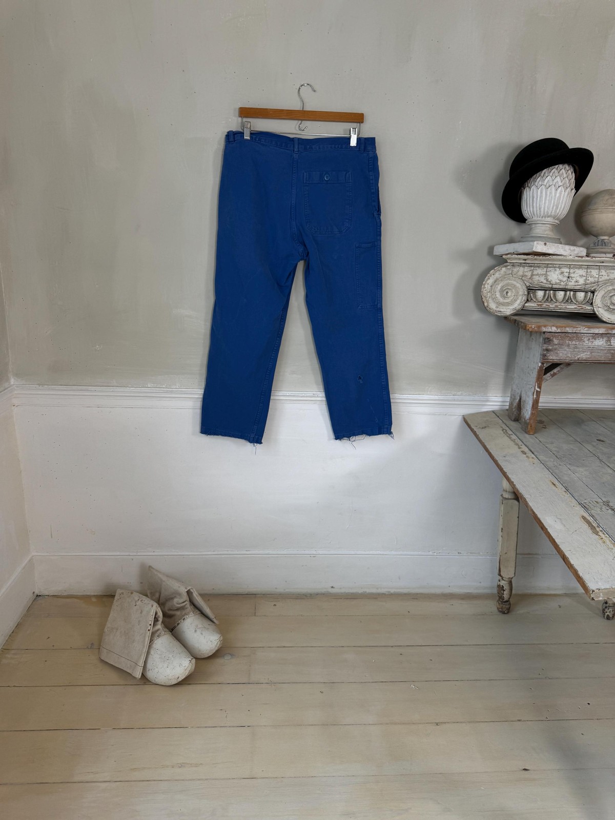 • 35 French Vintage blue workwear pants trousers distressed Patched mends repairs