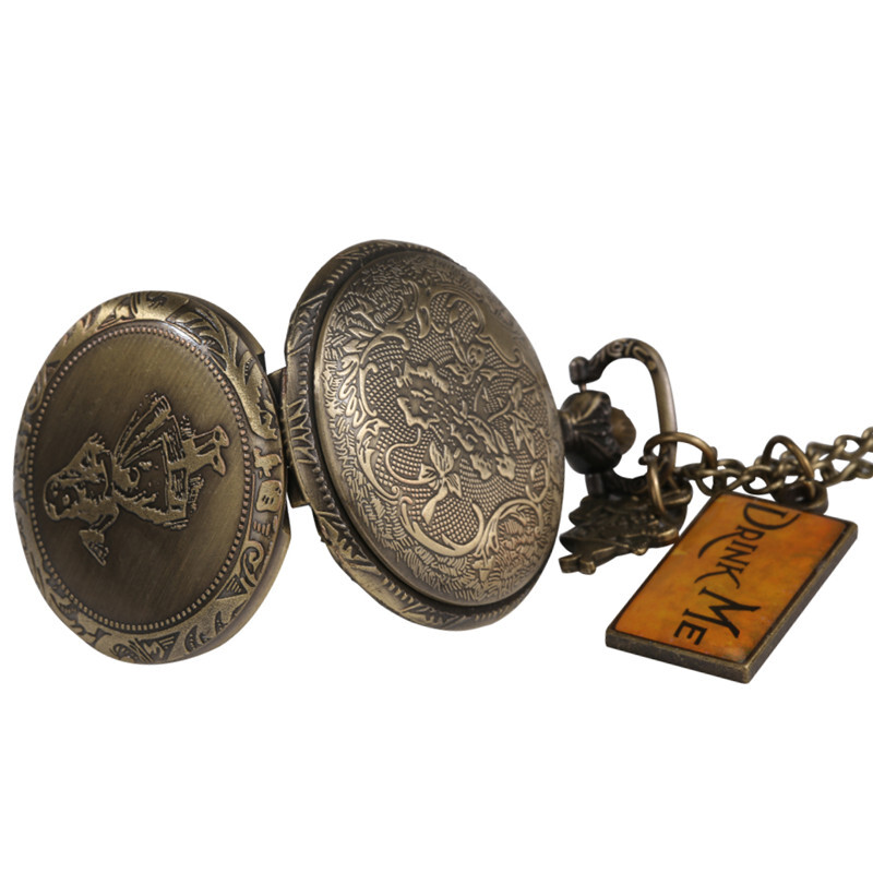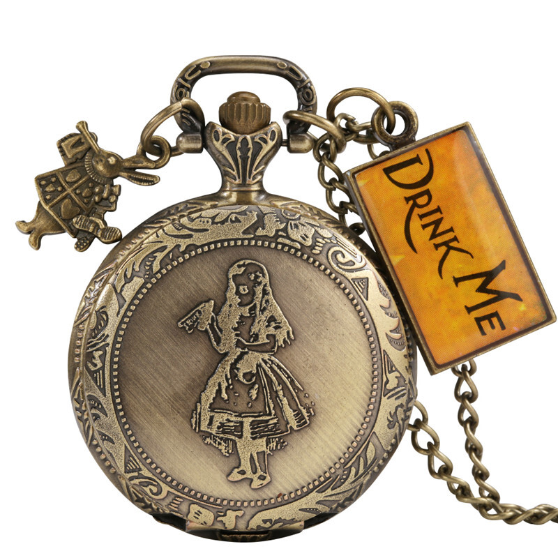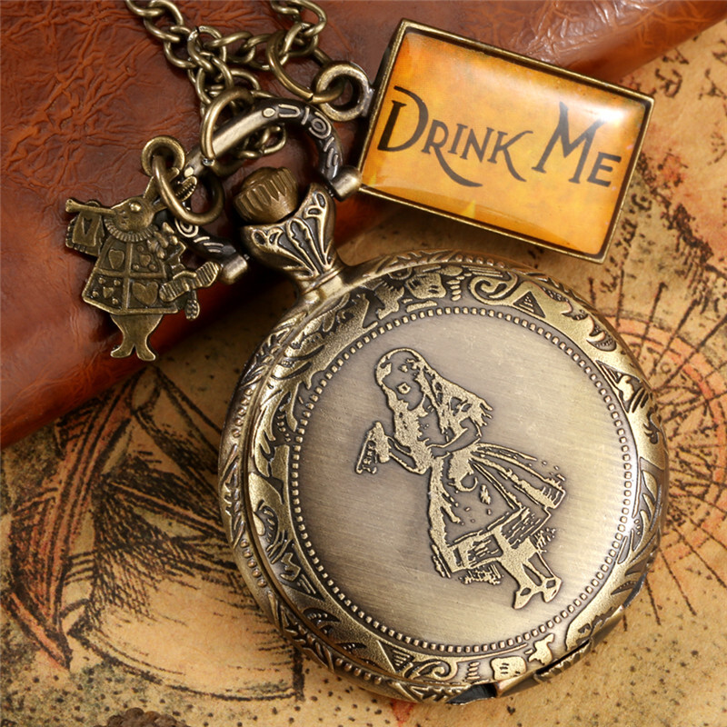 Lovely Girl Cover with Drink Me Tag Men Women Quartz Analog Pocket Watch Chain