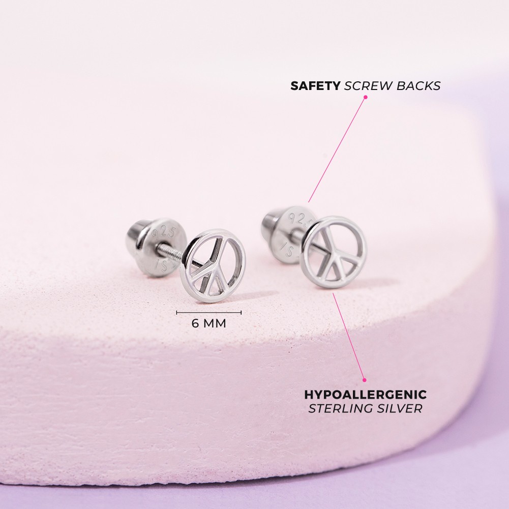 Retro Peace Sign Kids / Children's / Girls Earrings Screw Back - Sterling Silver