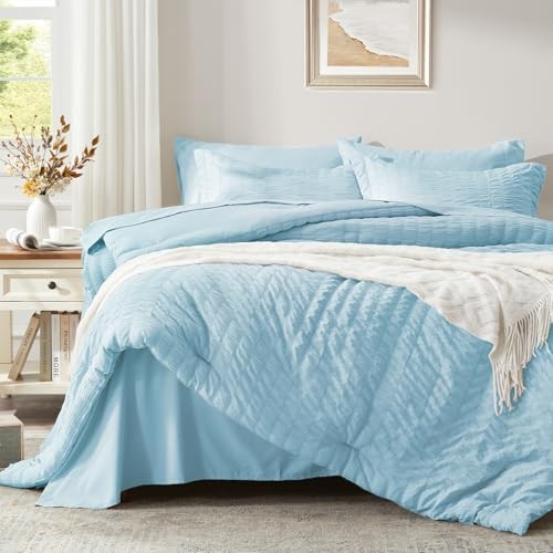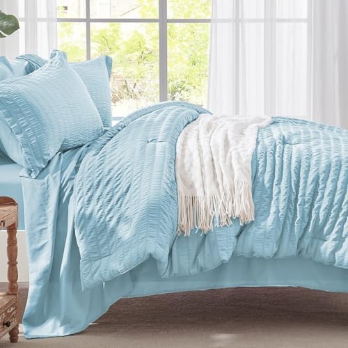Comforter Set 5 Pieces Seersucker Bed in a Bag with Comforter Twin Light Blue