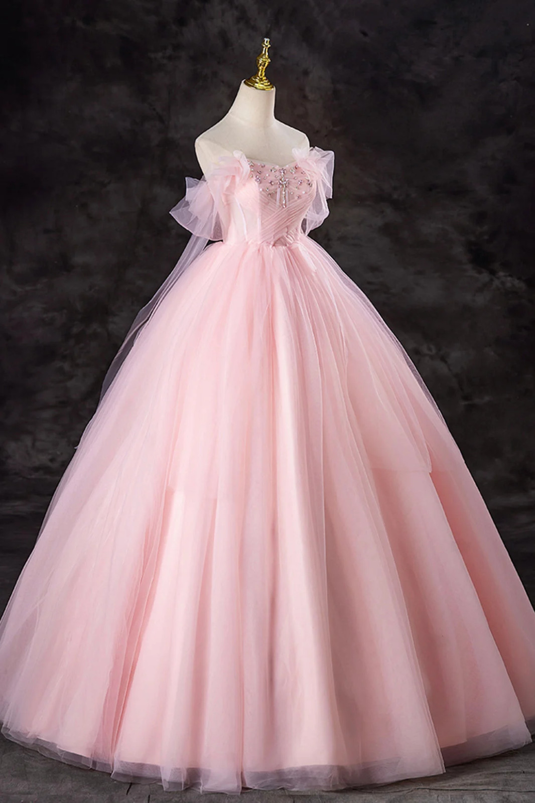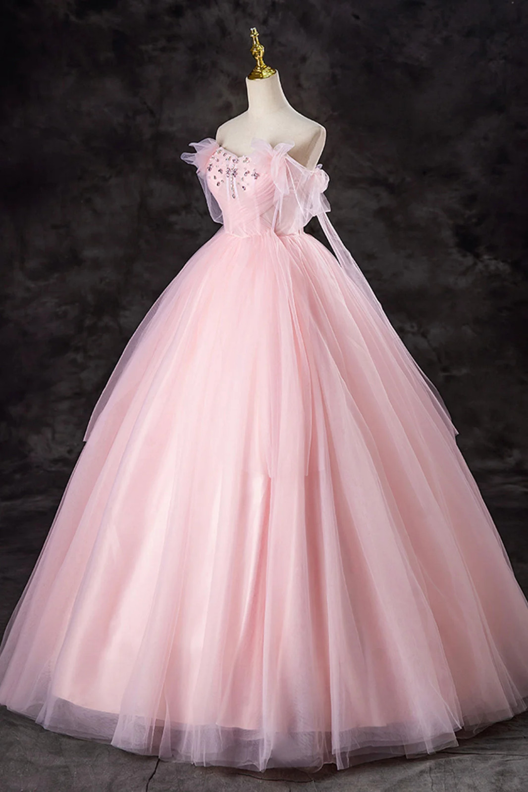 Pink Tulle Beaded Long Wedding Dresses Off the Shoulder A Line Bridal Gowns