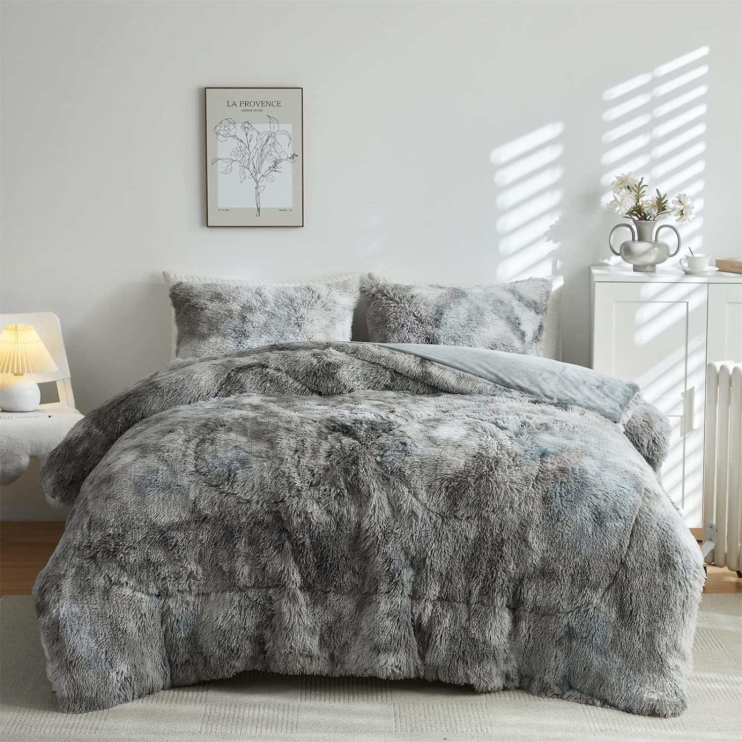 Faux Fur Plush Tie Dye Grey White Comforter Set Fluffy Fuzzy Shaggy Bedding Set