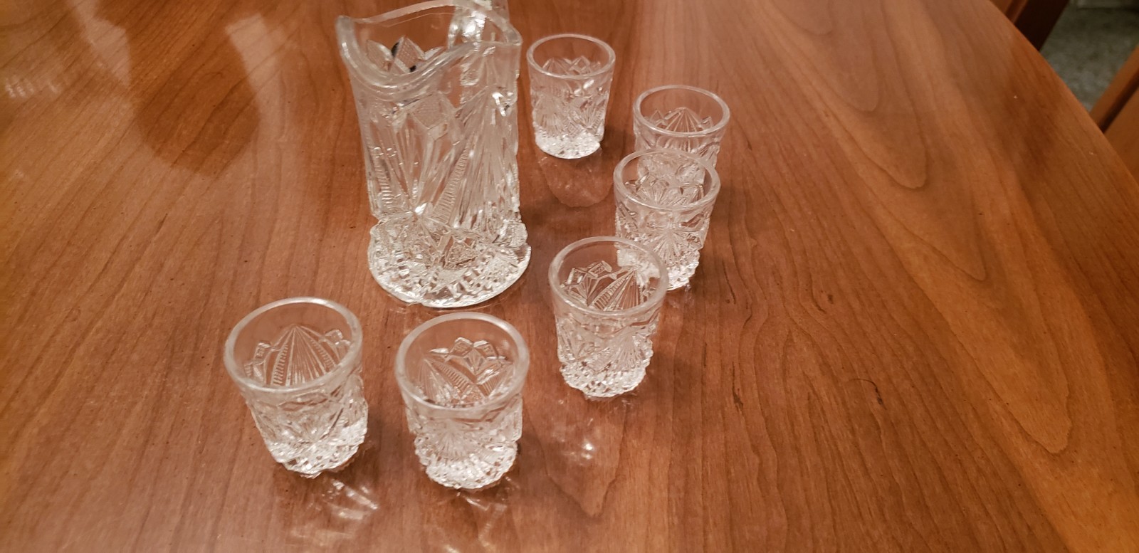 как выглядит EAPG Rex Water Set Child Toy Pitcher 6 Tumblers, Co-Operative Flint Glass Co фото