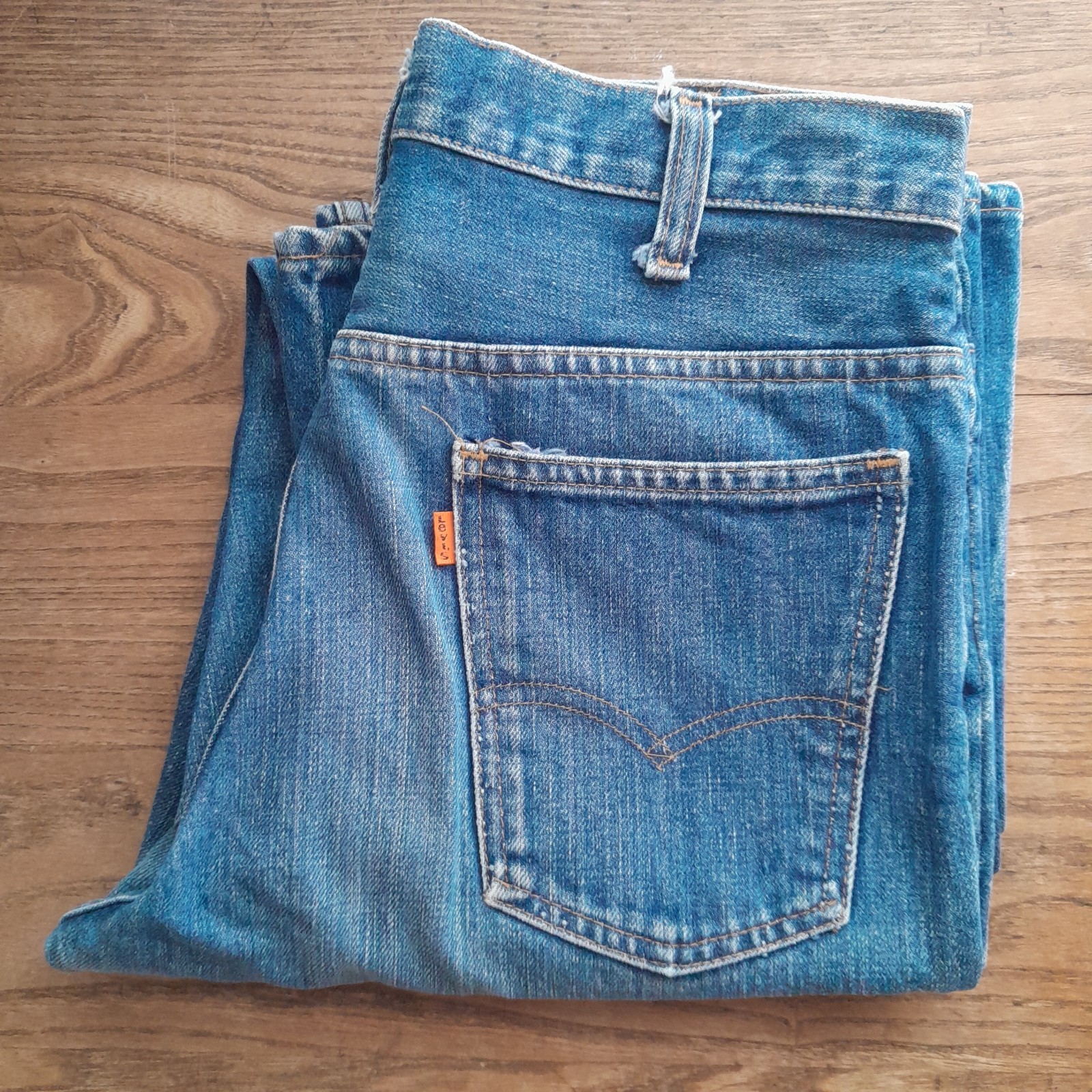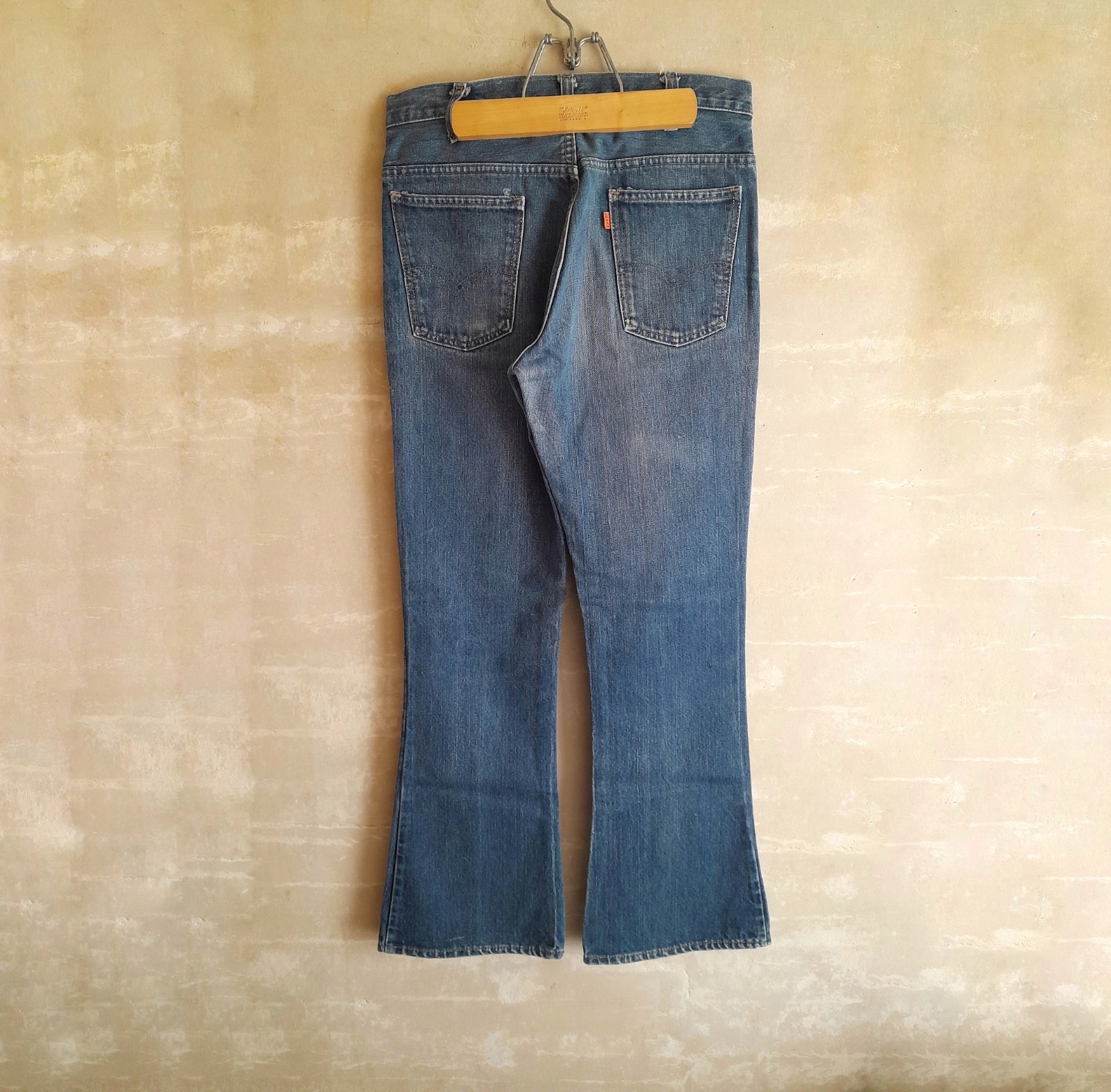 745. vintage blue Levi's bell bottom orange tab 70s denim jeans, 31x32 10