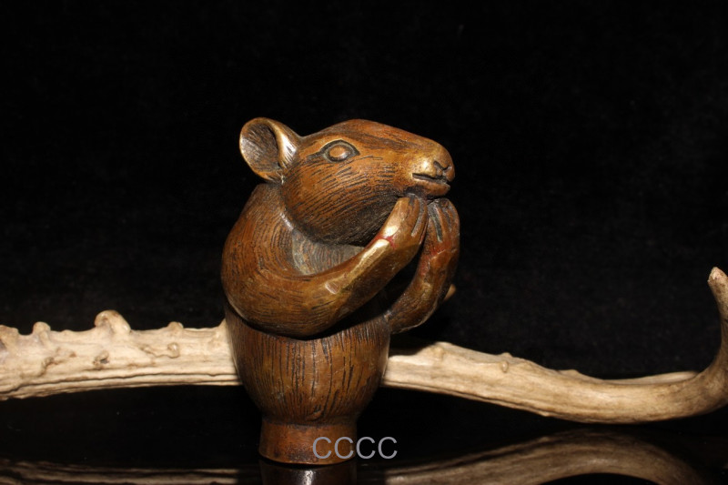 • Chinese Rare Retro Bronze Zodiac Rat Cane Walking Stick Head Handle Accessories