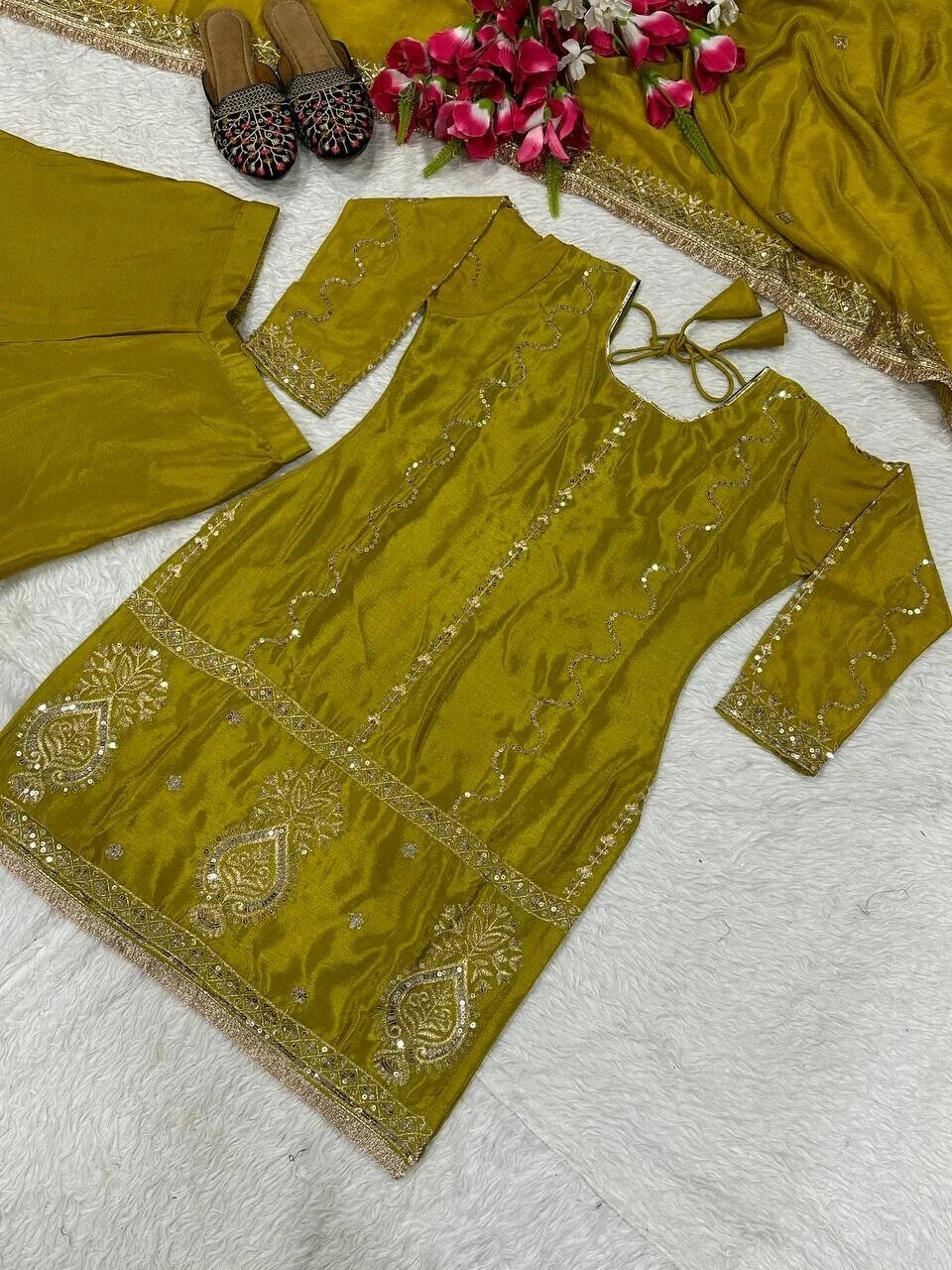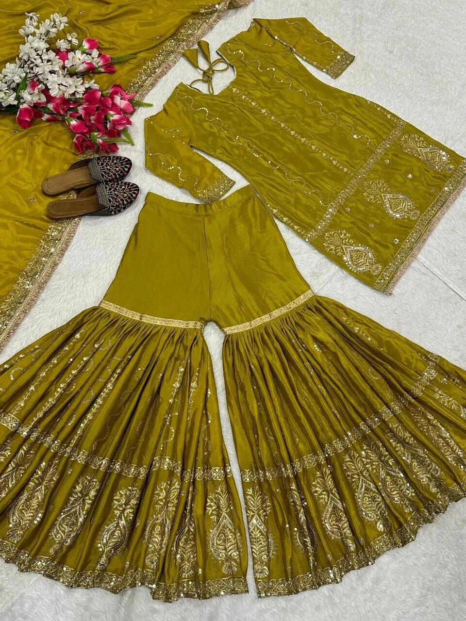 Indian Style Chinnon Silk Olive Green Top Sharara With Dupatta For Reception