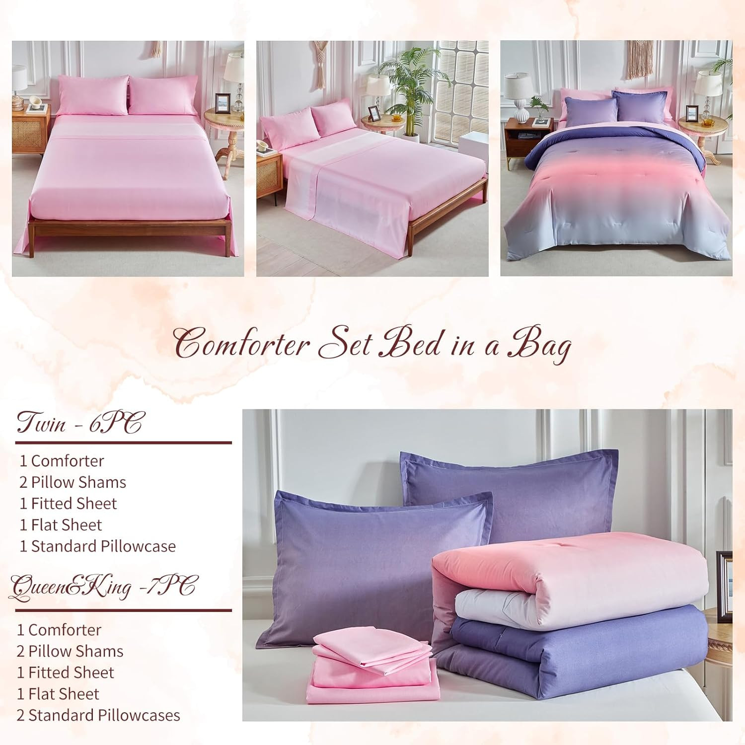 как выглядит Grey Pink and Purple Gradient Comforter Set Twin Size 6 Pieces Elegant Ombre Bed фото
