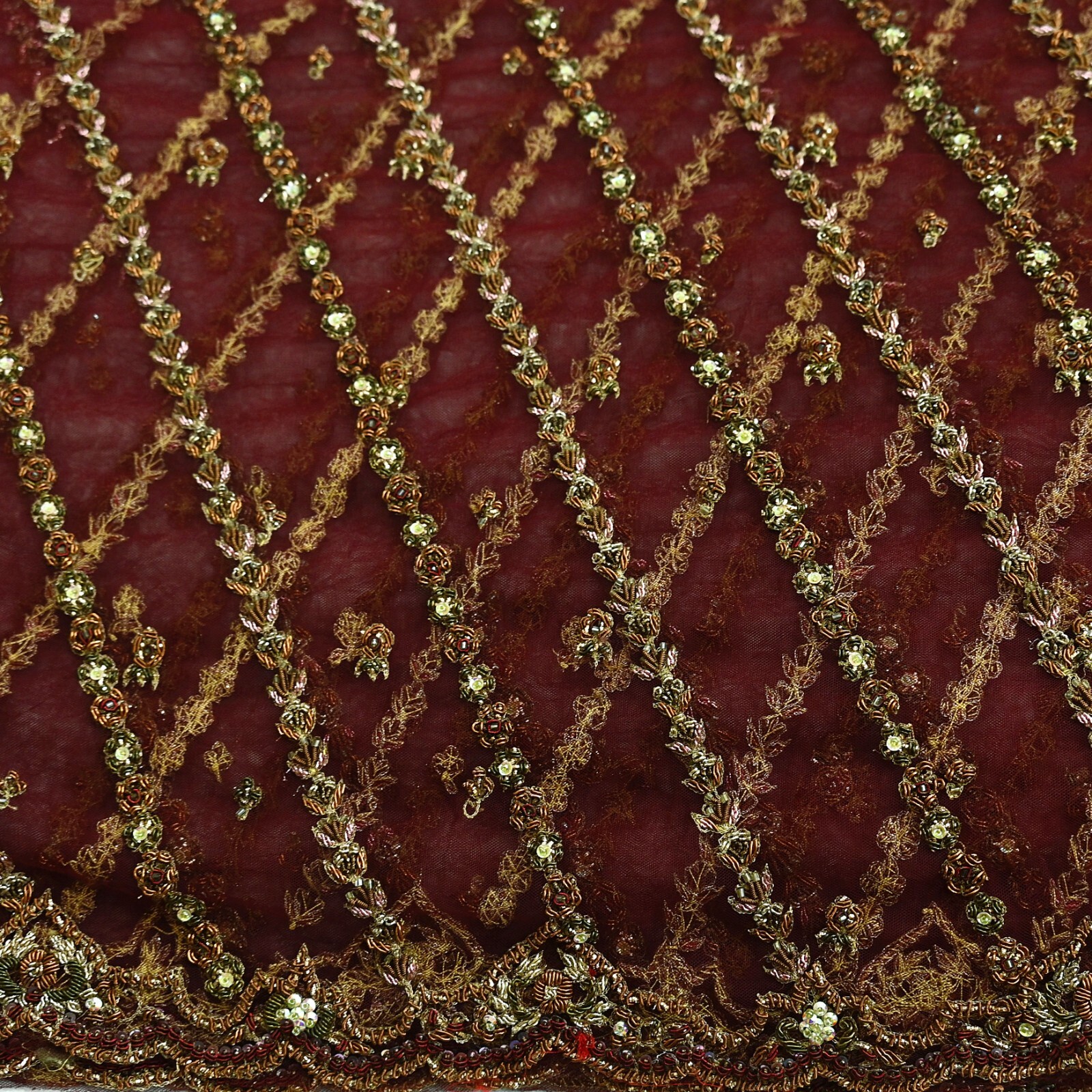 Vintage Heavy Wedding Maroon Dupatta Net Mesh Long Stole Hand Embroidered Scarve