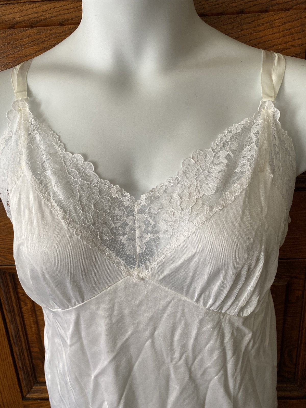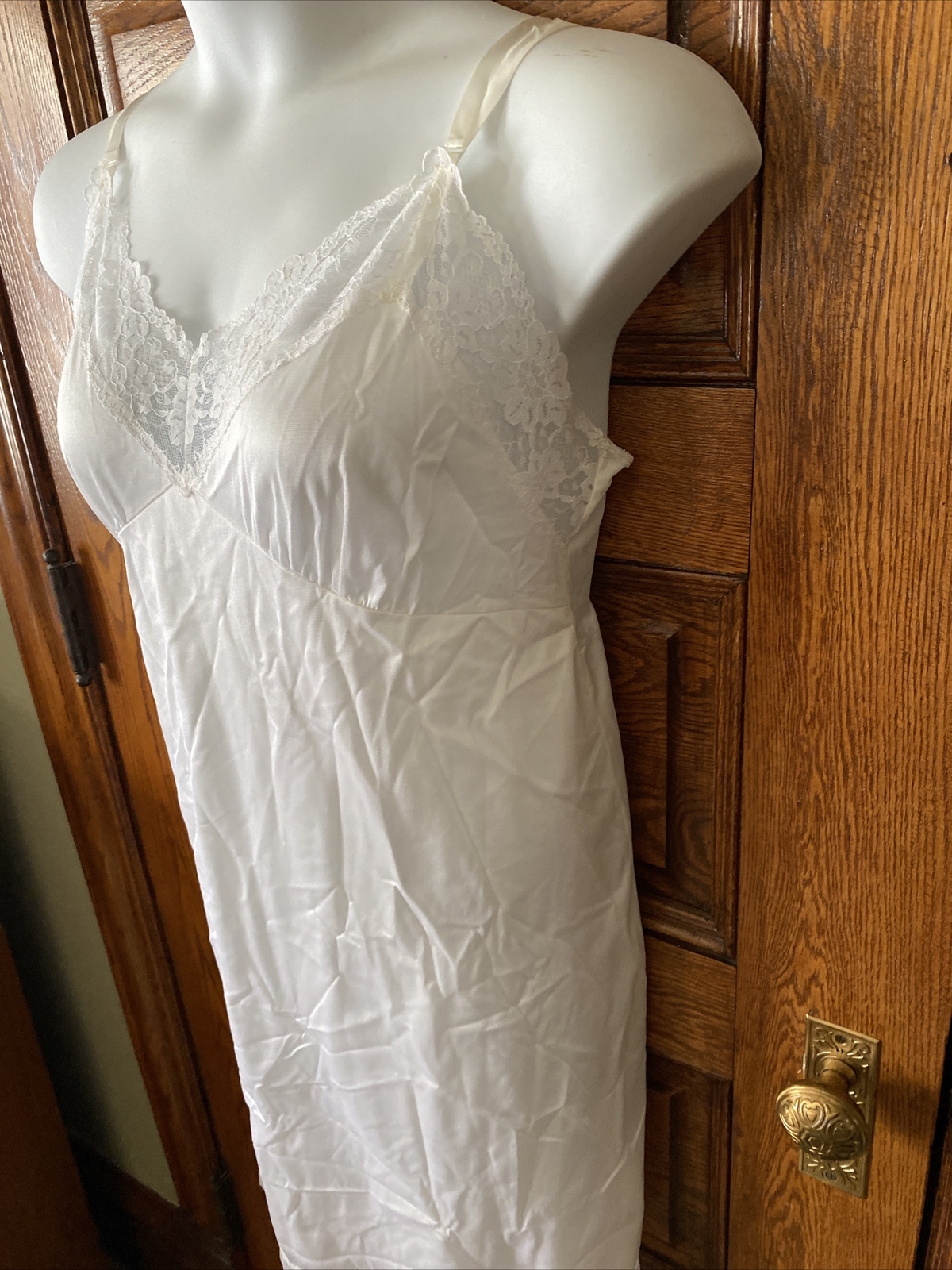 как выглядит VINTAGE 60s White Nylon Lace Trim Midi Nightgown Full SLIP, Made in USA, Size 40 фото