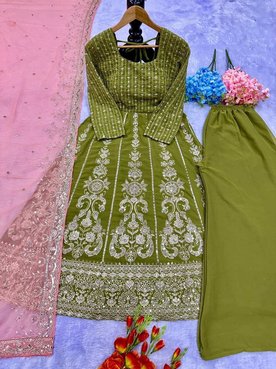 New Unique Olive Green Faux Georgette Top Palazzo With Dupatta For Women Wedding