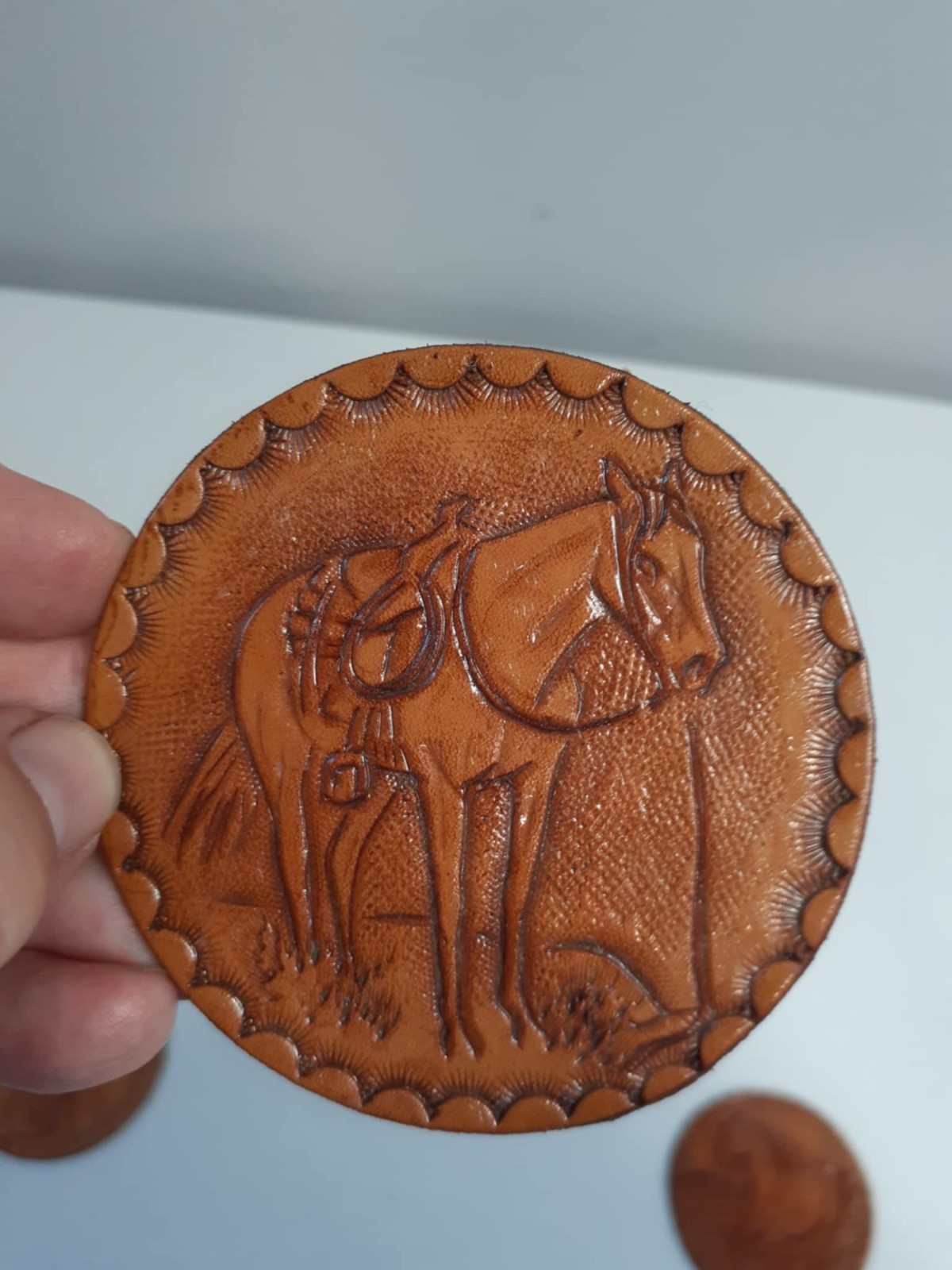 Handmade Real Leather Brown Round Circle Horse Coasters Set of 8