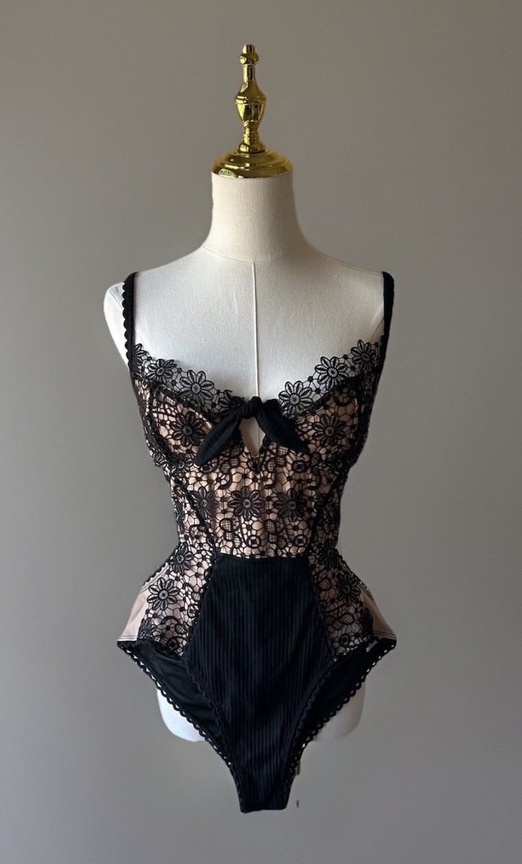 NWT Black Bodysuit With Floral Lace Detailing Size Fits More Like M MSRP 85