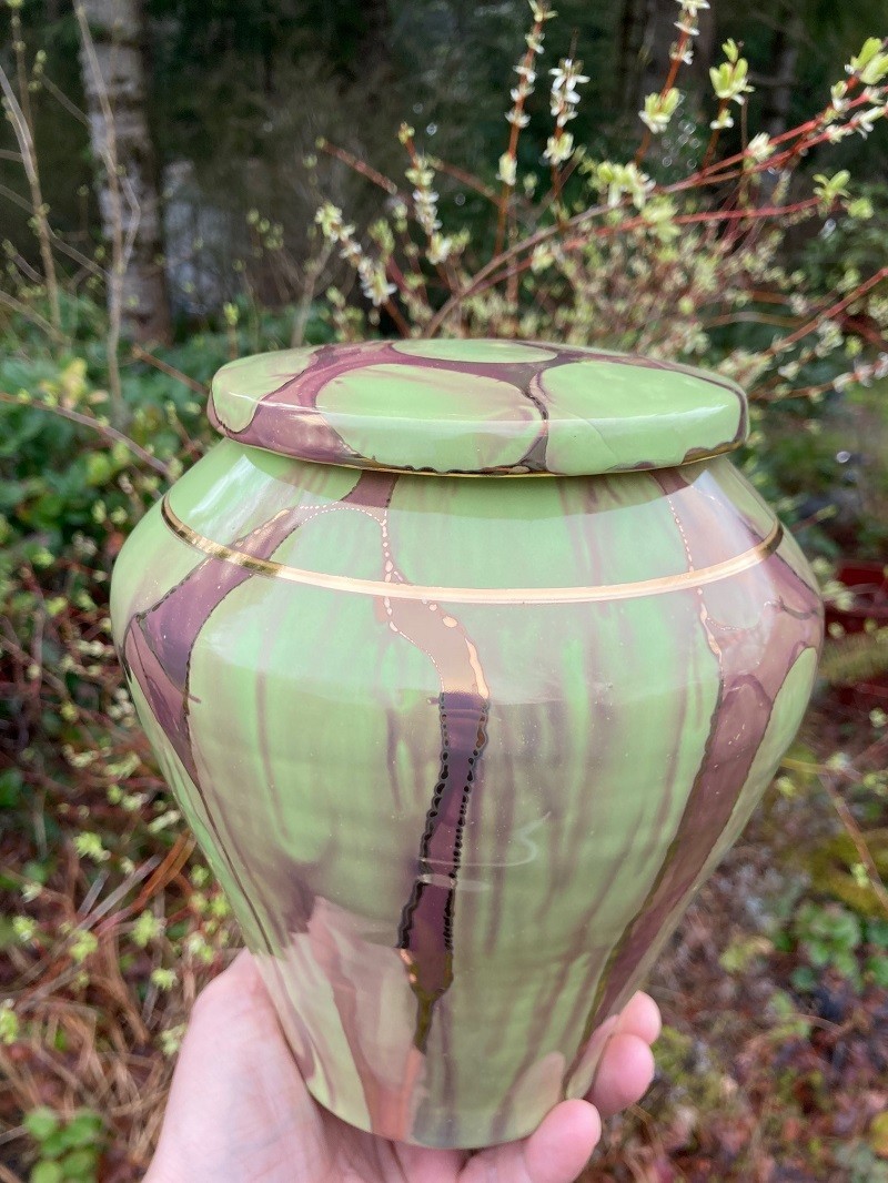 Handmade Ceramic Cremation Urn Keepsake Vessel in Lt Green w/Gold 150 cubic inch