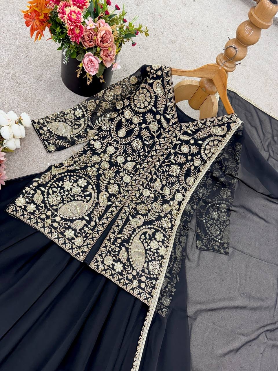 как выглядит New Beautiful Faux Georgette Top Palazzo And Black Dupatta For Function Party фото