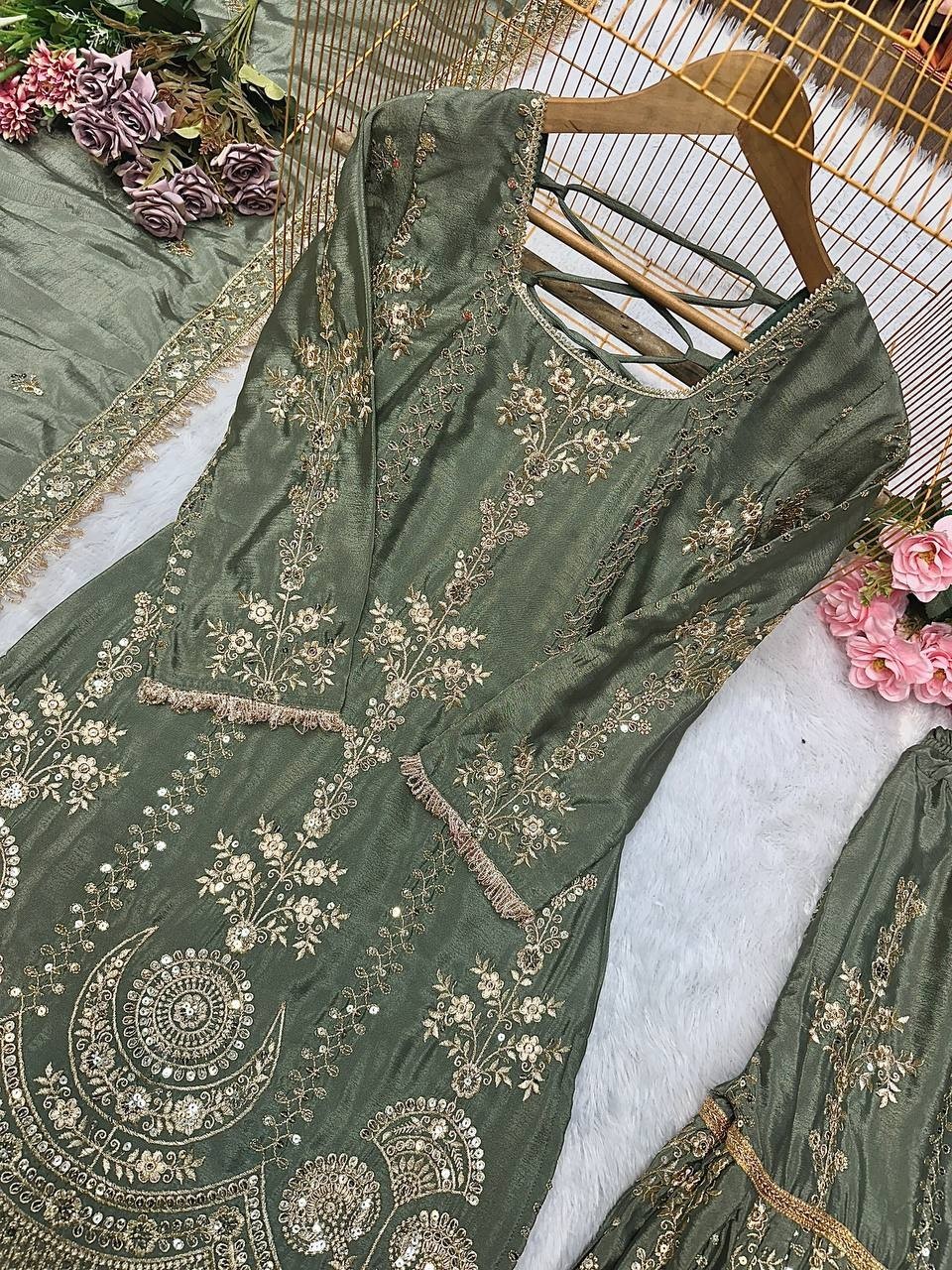 New Arrival Chinnon Silk Sage Green Top Sharara With Dupatta For Bollywood Party