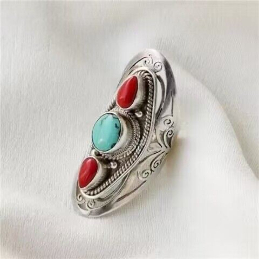 как выглядит Nepal Handmade Adjustable Ring Red Green Turquoise Ethnic Tibetan Style Jewelry фото