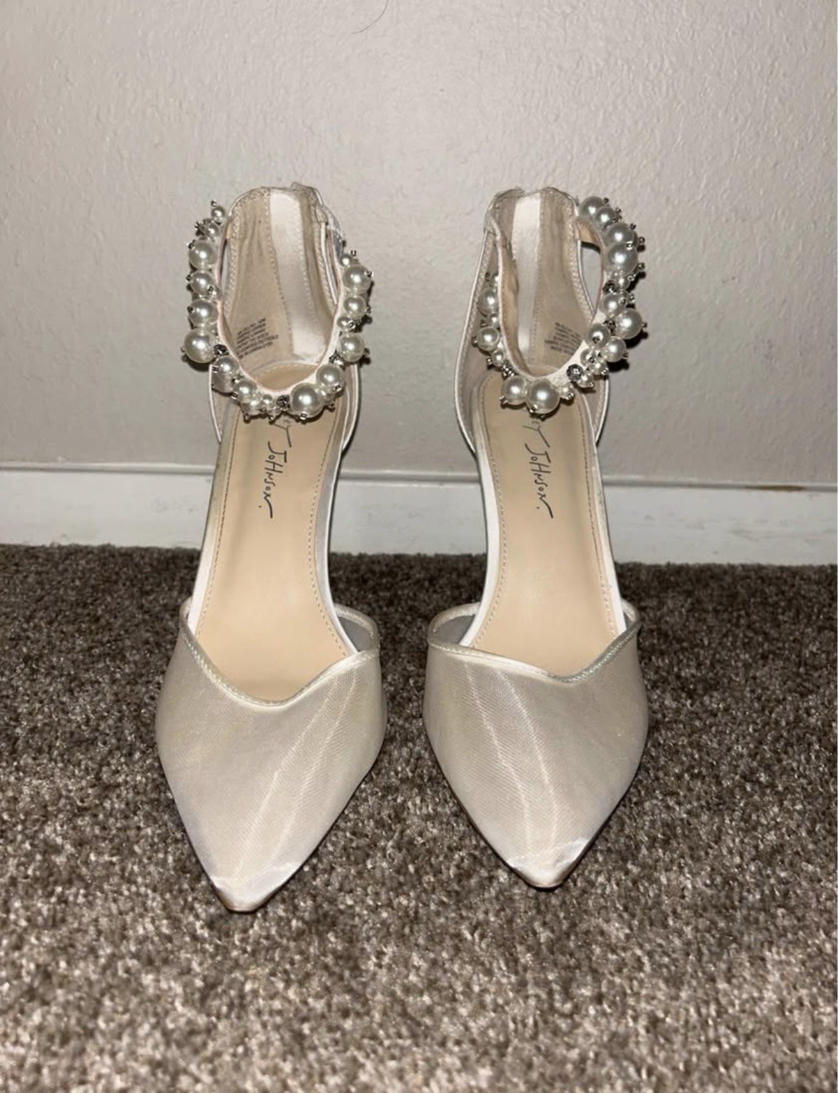 как выглядит Betsey Johnson SB-Ellah Ivory Satin Rhinestone Pearl Ankle Strap Pumps / size 10 фото