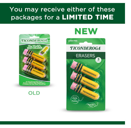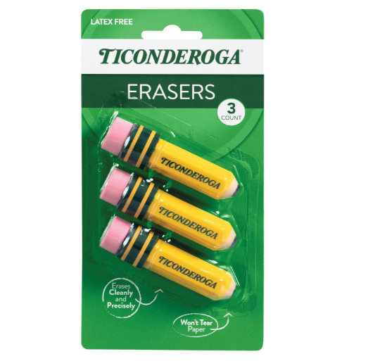 TICONDEROGA Erasers, Pencil Shaped, Latex-Free, Yellow, 3-Pack 38953