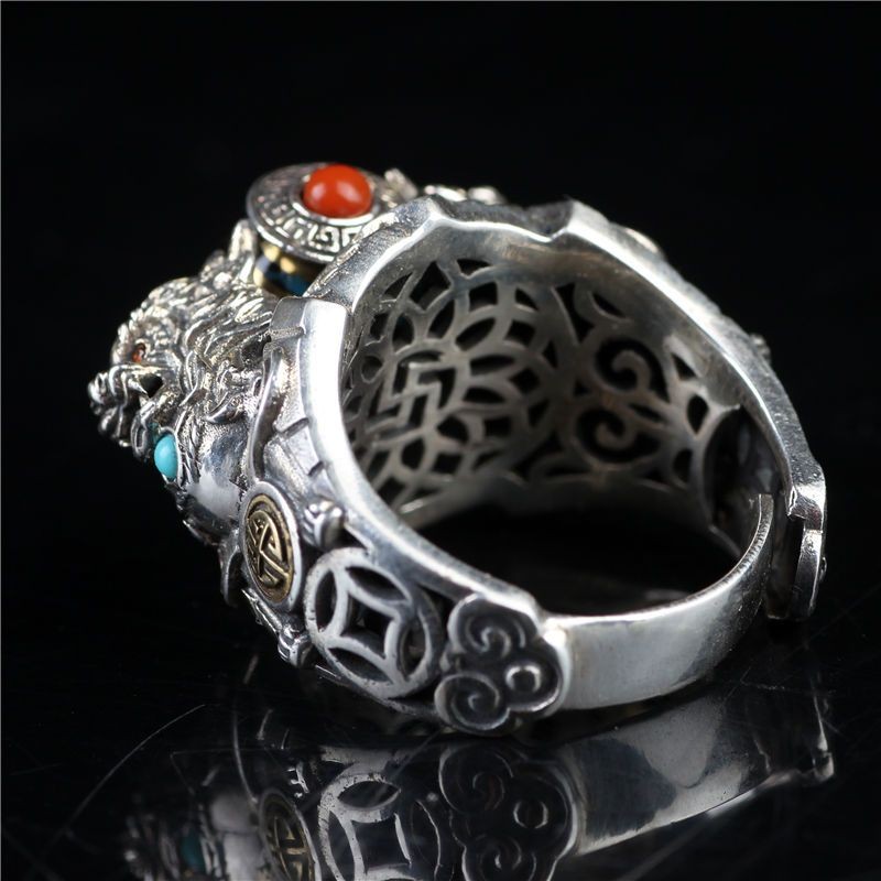 Tibetan Style Dzi Bead Ring Auspicious Beast Open Adjustable Unisex Jewelry