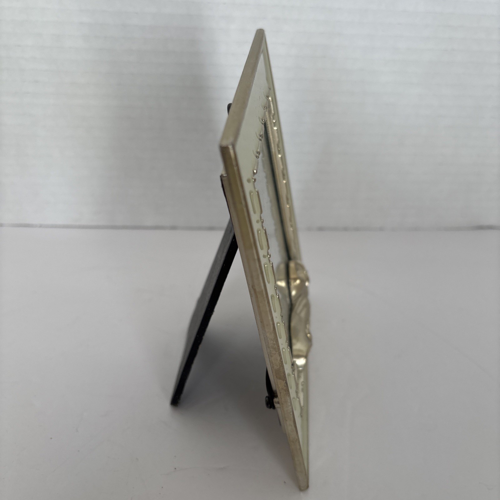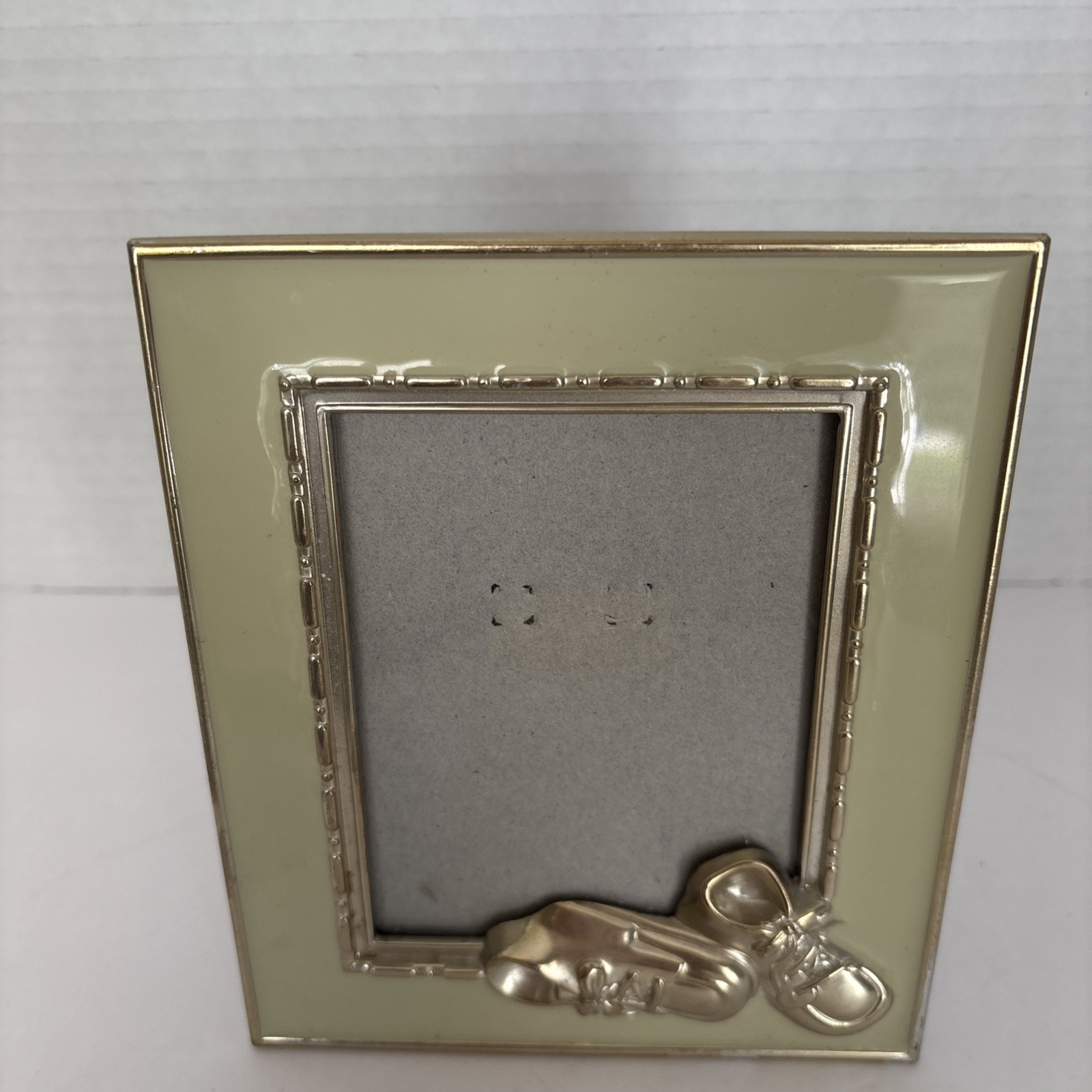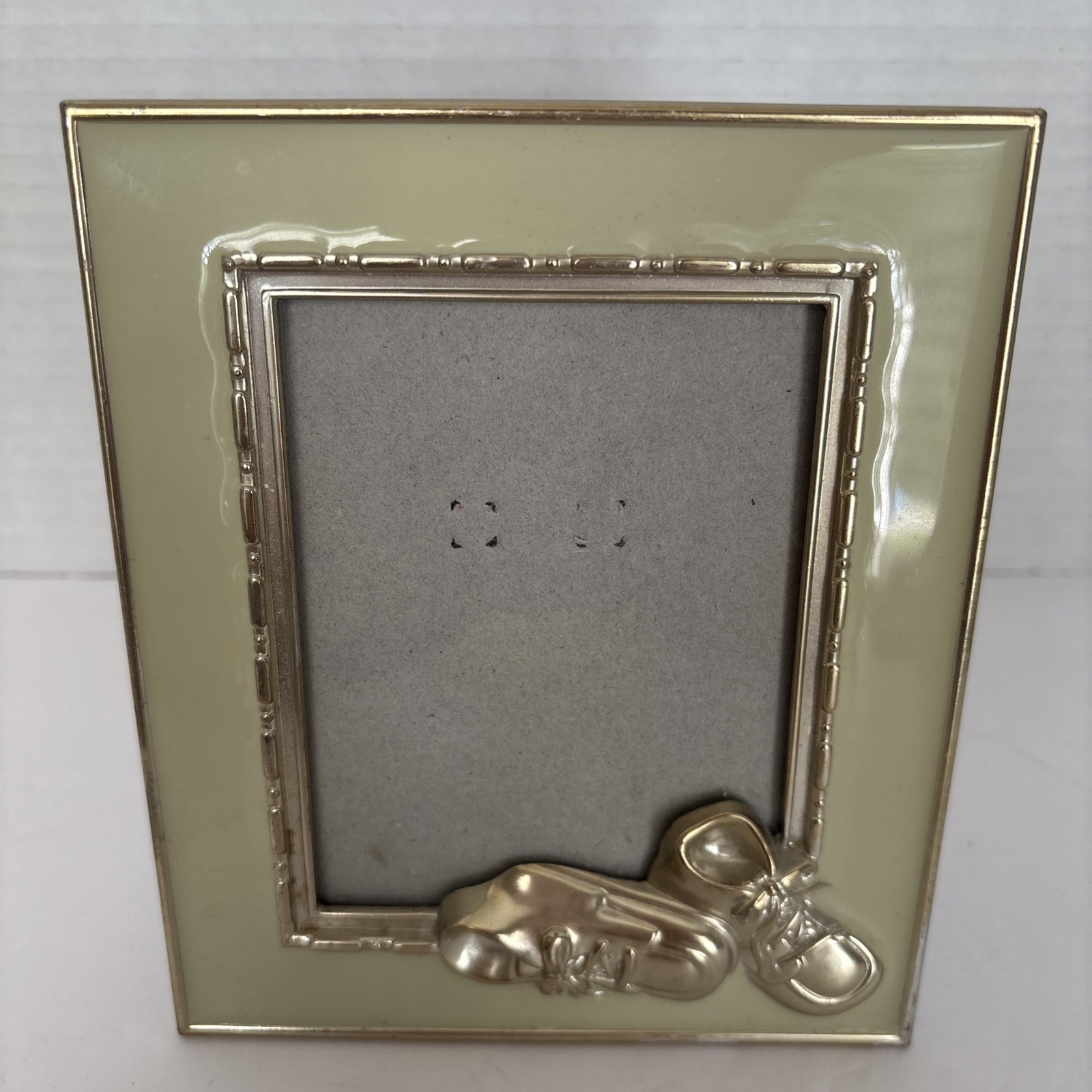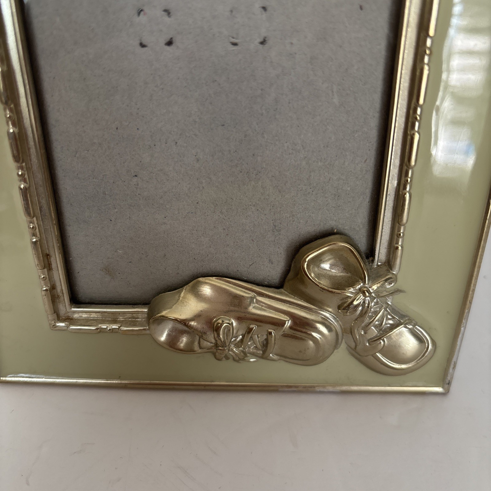 Vintage Baby Picture Frame Metal Sage Green Gold Edges Enamel 3D Booties Shoes