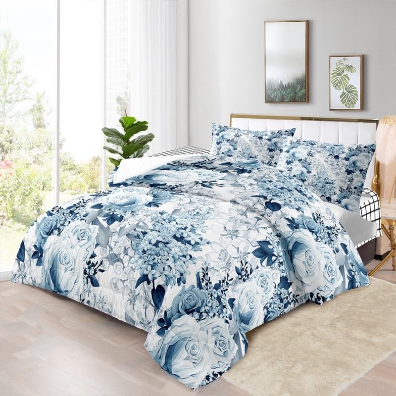 Flowers Comforter Set Queen Vintage Floral 3 Pieces 90x90inch Queen Teal Blue