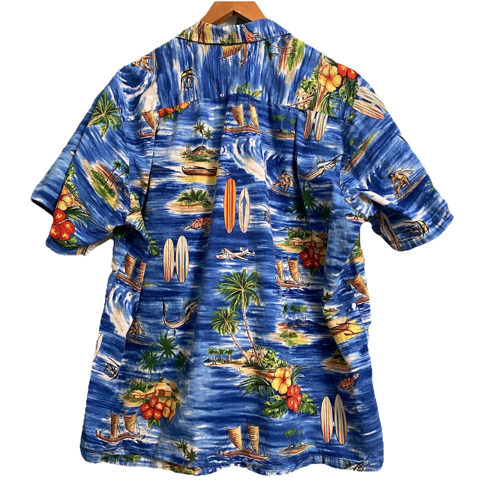 RJC Hawaiian Shirt XL Flower Island Surf Board Boat Island Palm Tree Hawaii Flaw